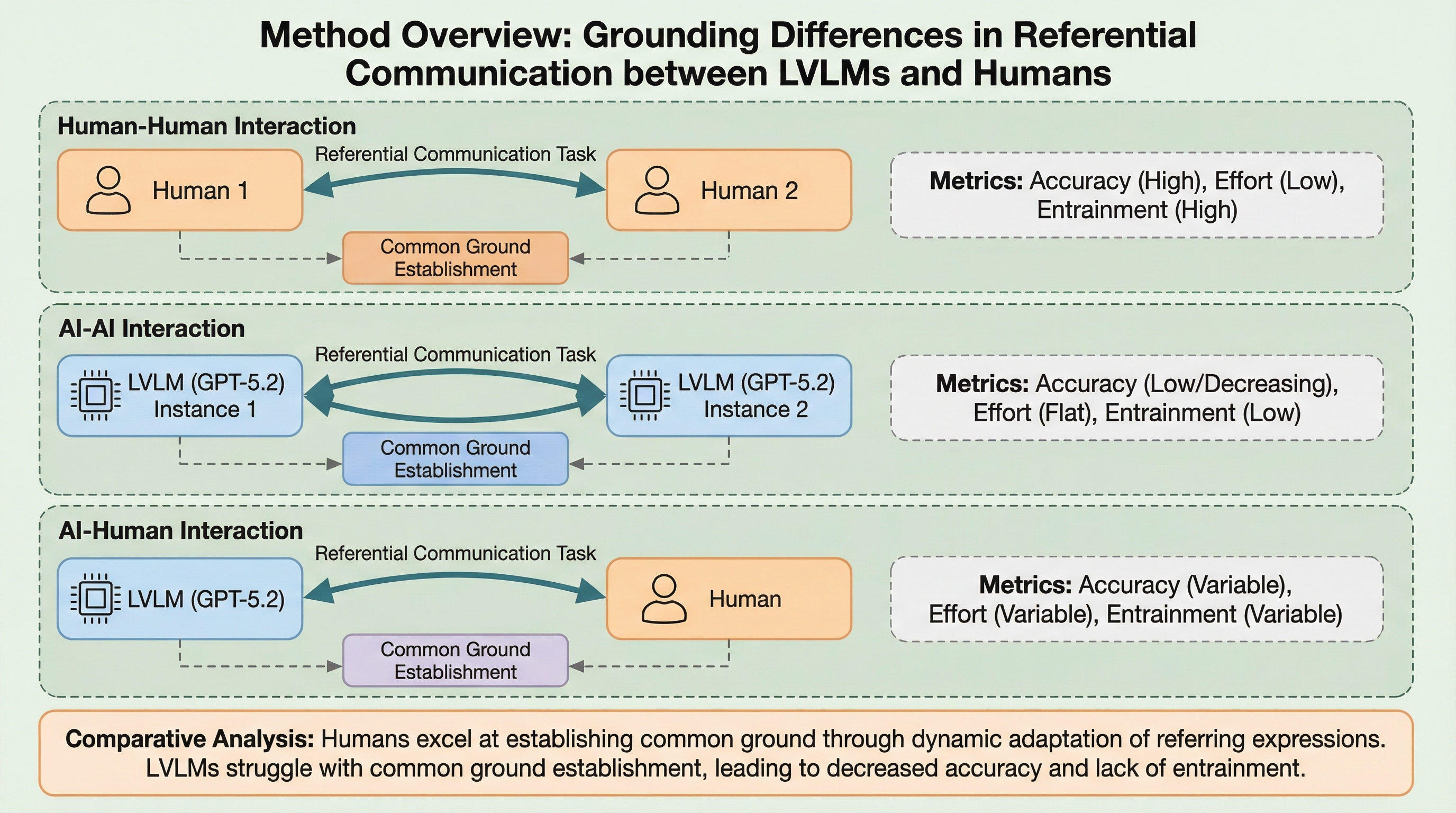 生成AIエージェントが人間と効果的に協力するには意図の予測が不可欠ですが、現在の大型視覚言語モデル(LVLM)は「共通基盤(コモングラウンド)」を構築する能力が欠如していることが明らかになりました。 本研究では人間とAIの様々な組み合わせによる参照的コミュニケーション実験を行い、人間が回数を重ねるごとに表現を簡略化し効率を高める一方で、AIは過剰に饒舌で相互理解の修復が困難であることを示しました。 収集された356の対話データを含むコーパスは、LVLMが対話を通じて参照表現を解決する際の限界を浮き彫りにしており、今後のAIの協調性向上に向けた重要なベンチマークとなります。