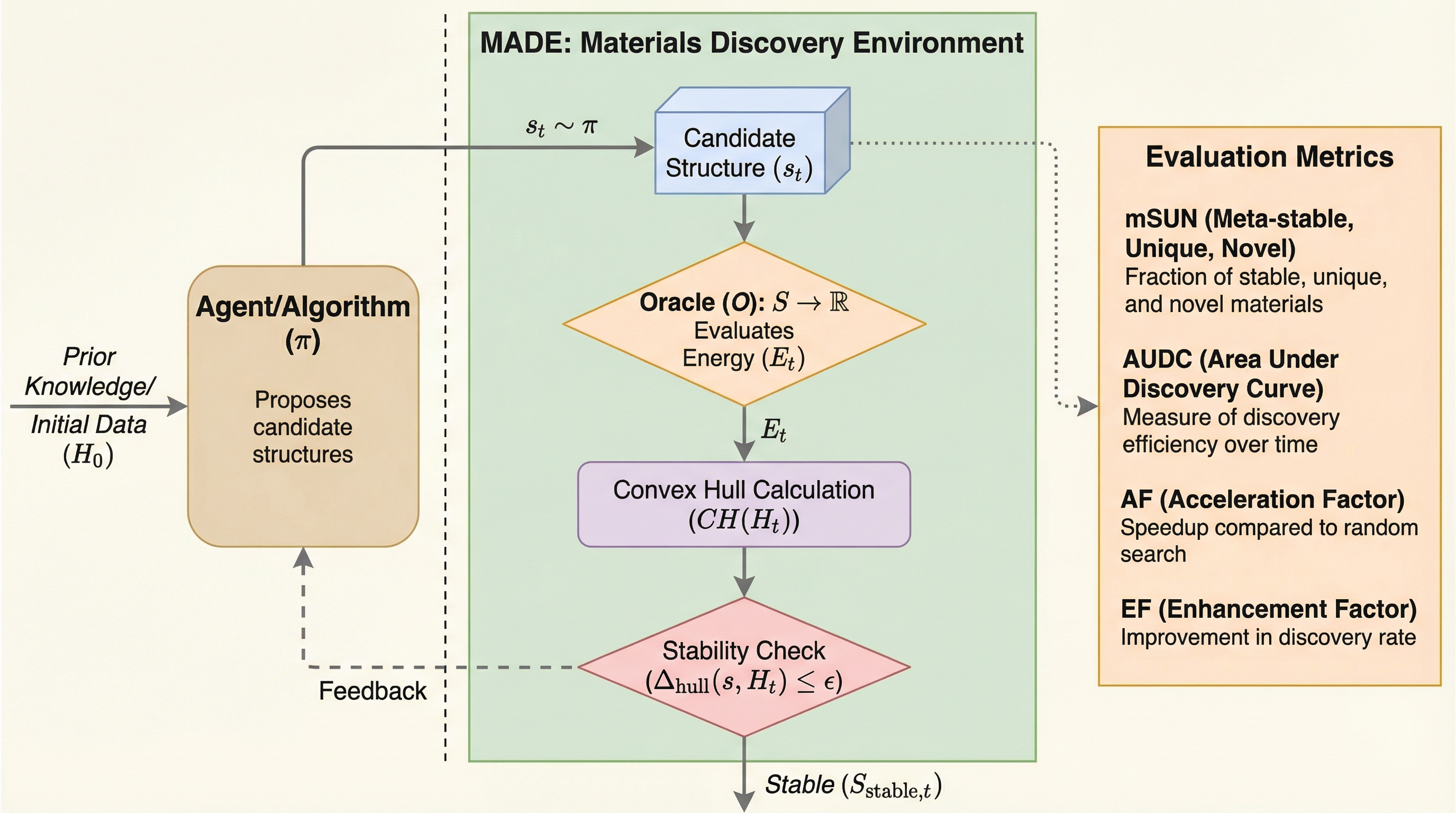 本研究では、クローズドループの材料探索パイプラインを評価するための環境群であるMADE(MAterials Discovery Environments)を提案しました。MADEは、エージェントやアルゴリズムが逐次的に候補構造を提案し、環境からのフィードバックを受け取り、限られたクエリ予算内で新しい熱力学的に安定な化合物を効率的に発見するために戦略を調整するプロセスをシミュレートします。 MADEの最大の特徴は、そのモジュール性と構成の柔軟性にあります。ユーザーは、プランナー(計画器)、ジェネレーター(生成器)、フィルター(濾過器)、スコアラー(評価器)といった交換可能なコンポーネントを任意に組み合わせてパイプラインを構築できます。…