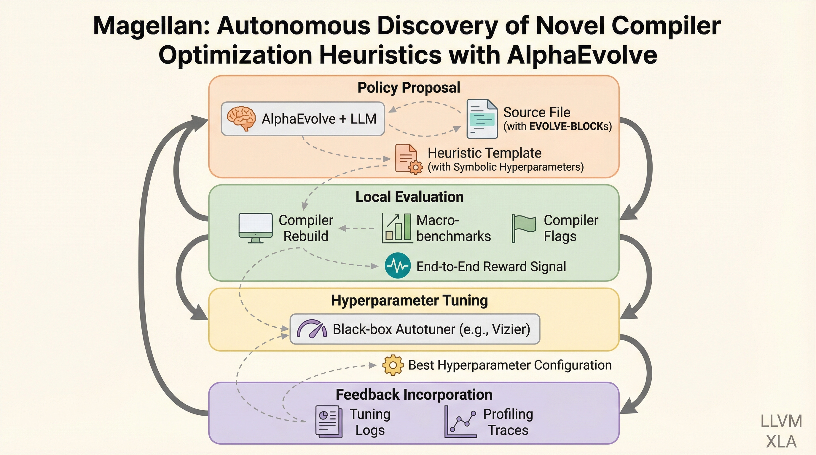 本研究では、LLMを活用したコーディングエージェントと進化探索、そして自動チューニングを組み合わせた自律型フレームワーク「Magellan」を提案しました。Magellanの核心的なアイデアは、コンパイラの最適化パスそのものを進化させ、実行可能なC++の決定ロジックを直接合成する点にあります。このシステムは、生成、評価、洗練というクローズドループの中で動作し、既存のコンパイラに直接統合できるコンパクトなヒューリスティクスを生成します。…