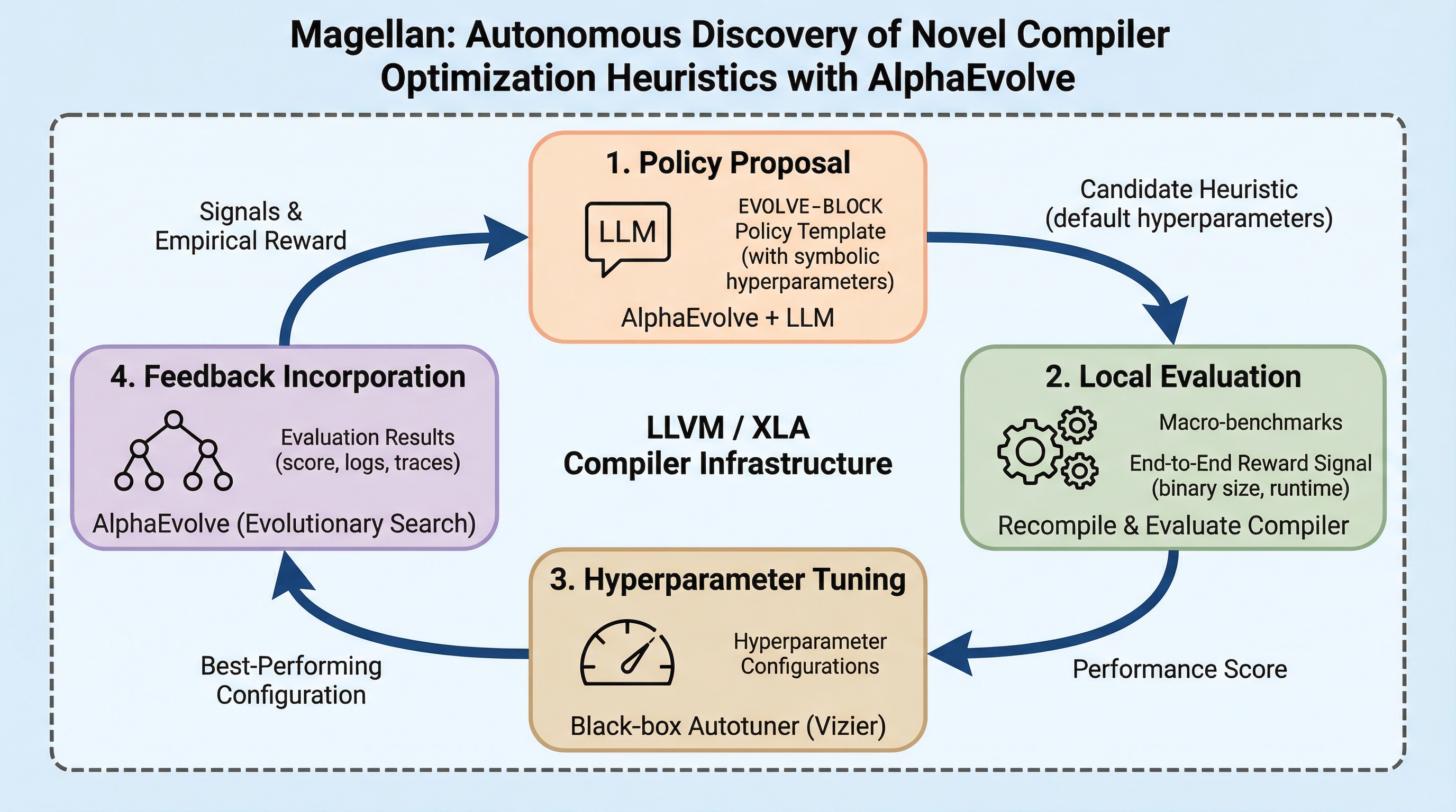 Magellanは、大規模言語モデル(LLM)と進化的探索、自動チューニングを組み合わせることで、コンパイラの最適化パスを制御するC++の意思決定ロジックを自律的に生成するエージェント型フレームワークである。 LLVMの関数インライニングにおいて、数十年にわたる手動エンジニアリングを凌駕する5.