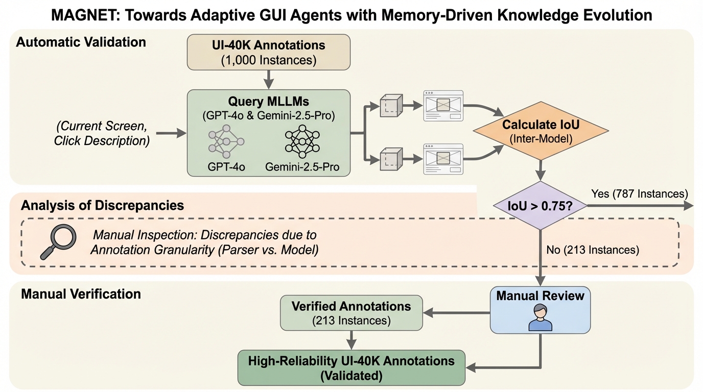 本研究では、インターフェースの外観や手順が変化しても、その背後にある「機能的な意味」と「タスクの意図」は根本的に安定しているという洞察に基づき、メモリ駆動型の適応型エージェントフレームワーク「MAGNET」を提案した。このフレームワークの核心は、二つの異なるレベルで安定性を活用するデュアルレベル・メモリ構造にある。 一つ目は「定常メモリ(Stationary Memory)」である。これは、多様な視覚的特徴を不変の機能的意味に結びつける役割を果たす。例えば、アイコンの形が変わっても「検索」という機能は変わらないため、視覚的なパッチと機能説明をペアで保持することで、外観の変化に左右されない堅牢なアクションの接地(グラウンディング)を可能にする。二つ目は「手続きメモリ(Procedural Memory)」である。これは、ワークフローが再編されても変わらない高レベルのタスク目標を捉える。…