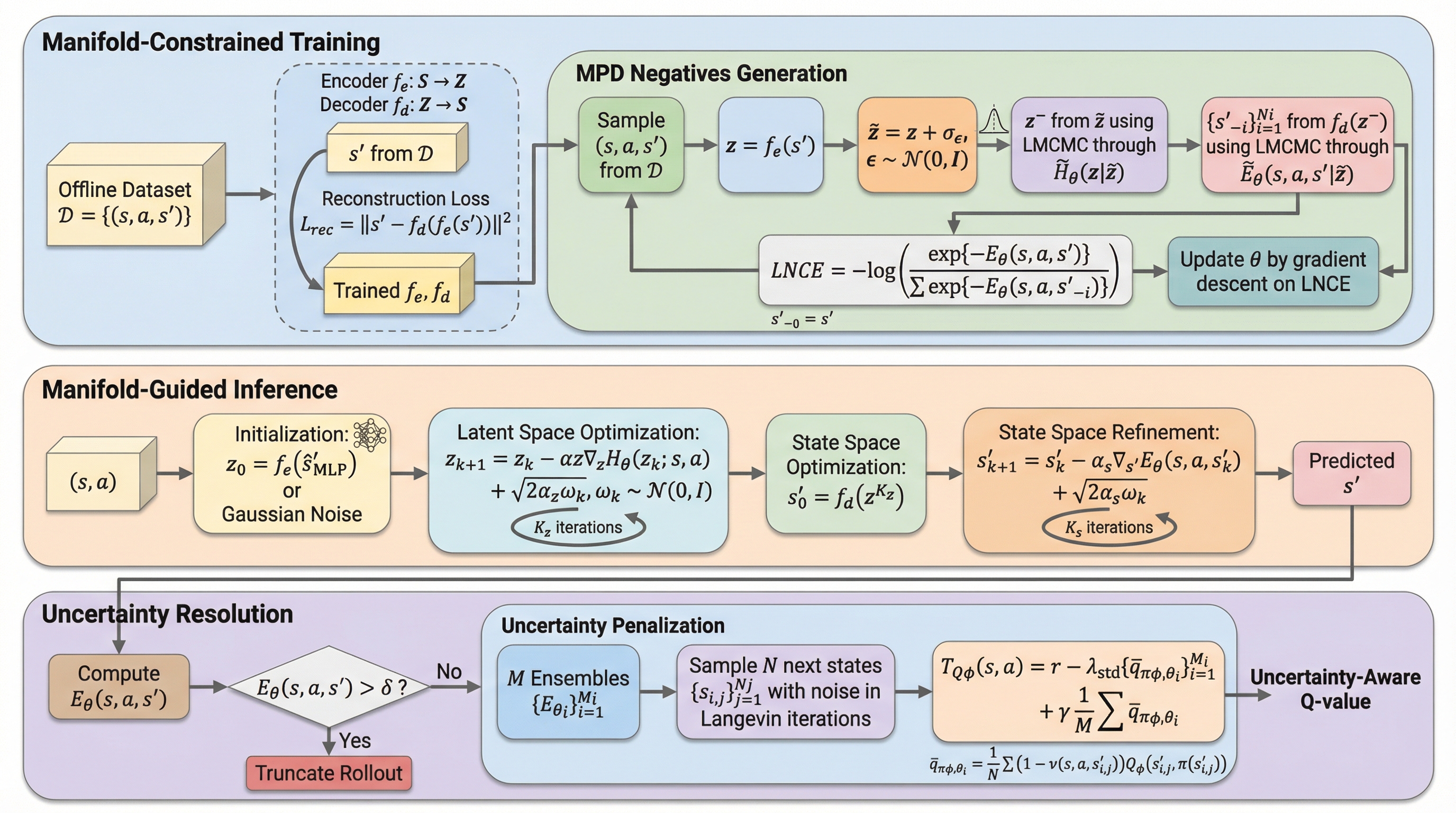 オフライン強化学習における分布シフトと価値の過大評価を解決するため、多様体制約付きエネルギーベース遷移モデル(MC-ETM)が提案され、低次元多様体近傍での負例生成によりエネルギー地形を鋭敏化し、分布外への逸脱を正確に検知する手法が確立されました。