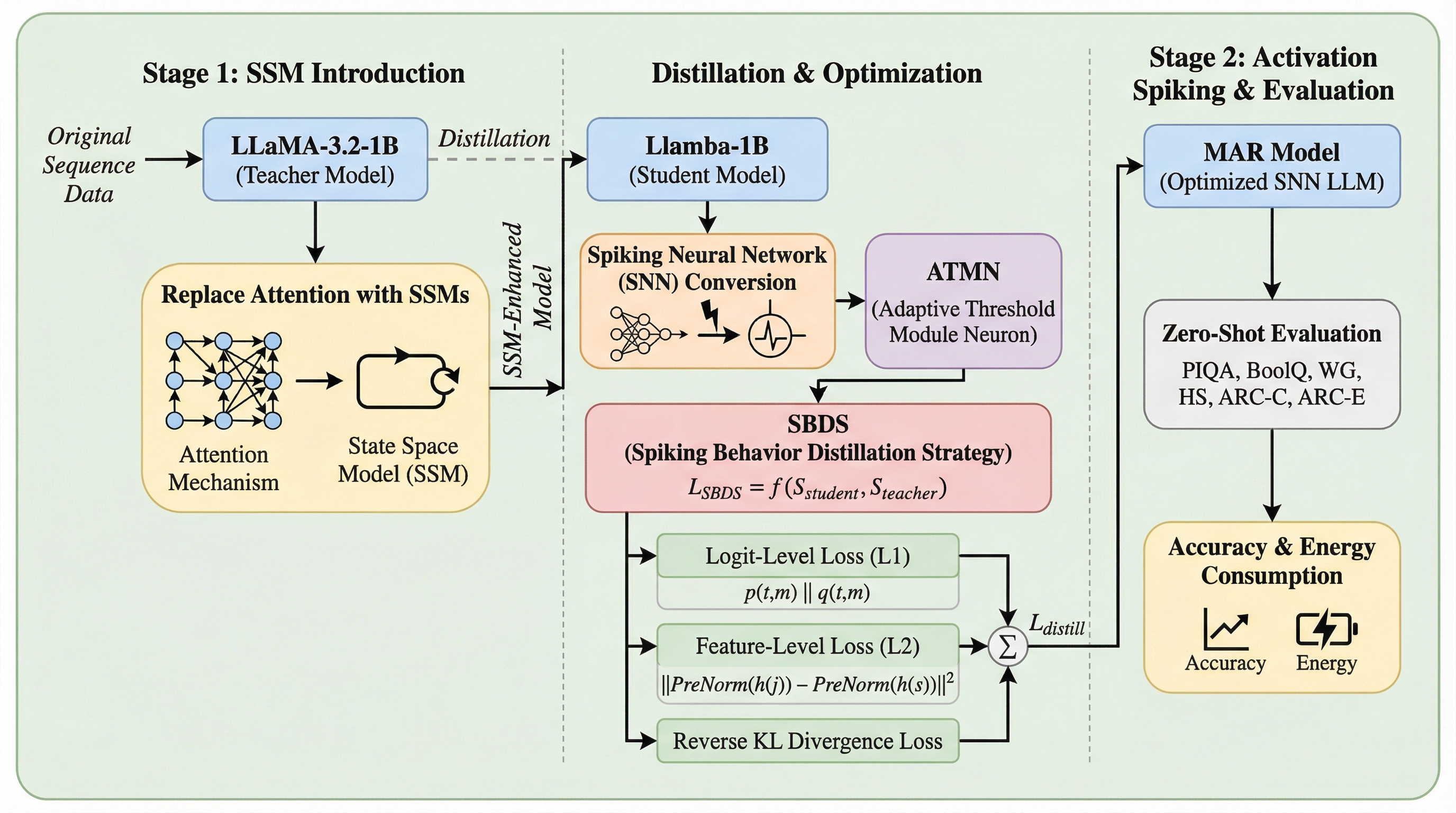 MARは、計算負荷の高い注意機構を線形時間の状態空間モデル(SSM)に置き換えた上で、フィードフォワードネットワーク(FFN)をスパイキングニューラルネットワーク(SNN)によってスパース化する、二段階のモジュール対応アーキテクチャ洗練フレームワークである。 従来のSNNが抱えていた情報密度の低さや時間的な不整合という課題を克服するため、負の信号も表現可能な適応型三値マルチステップニューロン(ATMN)と、事前正規化アライメントを含むスパイク対応双方向蒸留戦略(SBDS)を独自に設計している。 1.4Bのモデル規模でありながら、複数のベンチマークで7B規模の既存効率化モデルを凌駕する平均57.93%の精度を記録し、推論時のエネルギー消費を大幅に抑制しつつ、教師モデルである高密度モデルの性能を効果的に回復させることに成功した。