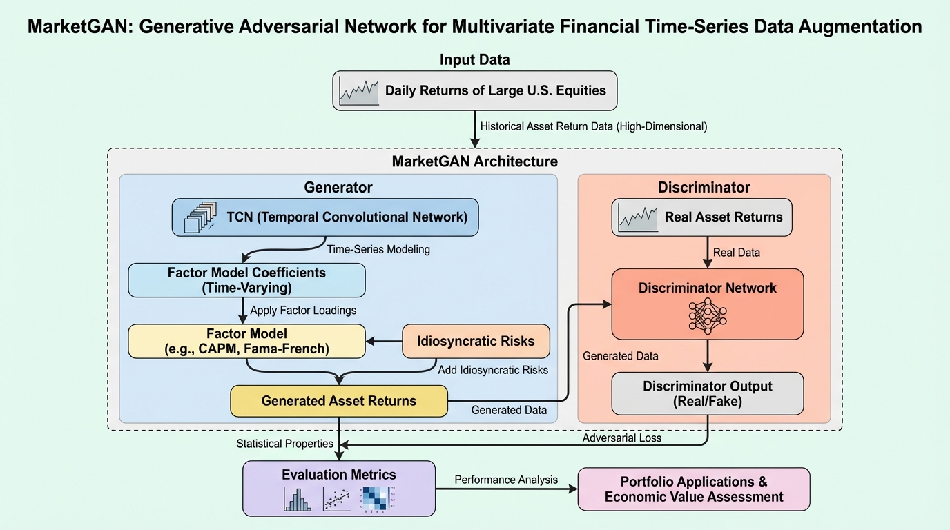 金融市場における高次元な資産収益率の生成は、利用可能なデータが限られているため、推定が極めて困難であるという課題に直面しています。 本研究で提案されたMarketGANは、資産価格モデルの要素構造を経済的なバイアスとして組み込み、時間的畳み込みネットワーク(TCN)を用いて動的な要因負荷量やボラティリティをモデル化する生成フレームワークです。 米国株式のデータを用いた検証では、従来のブートストラップ手法よりも高い精度で相関構造やテールの共動性を再現し、ポートフォリオ最適化においても優れた経済的価値を示すことが確認されました。