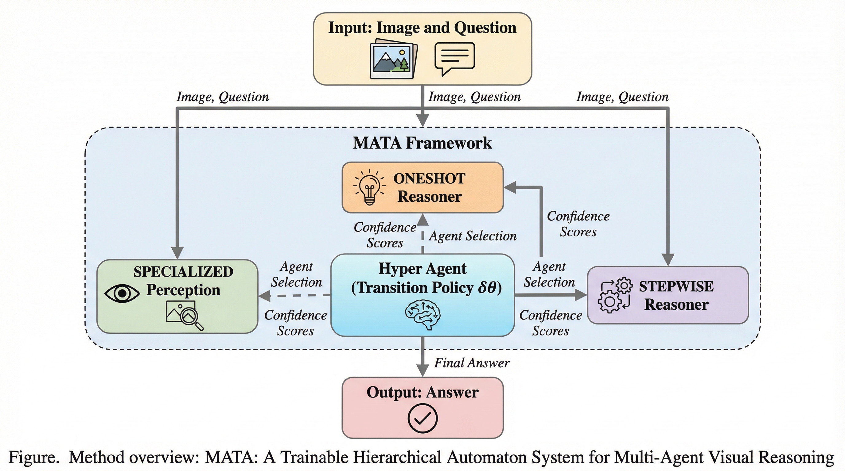 視覚言語モデルは高い知覚能力を持つ一方で、複雑な推論における「幻覚」やプロセスの不透明さが課題となっており、本研究ではこれを解決するために推論過程を有限状態オートマトンとしてモデル化しました。 提案手法である「MATA」は、学習可能なハイパーエージェントが複数の専門エージェントを動的に切り替える階層構造を採用し、共有メモリを介してエージェント間の高度な協調と競争を実現することで、推論の透明性と精度を両立させています。 9万件の遷移軌跡から構築されたデータセットを用いて微調整された大規模言語モデルを制御塔とすることで、複数の視覚推論ベンチマークにおいて従来手法を凌駕する最高水準の性能を達成し、複雑なタスクにおける新たな基準を提示しました。