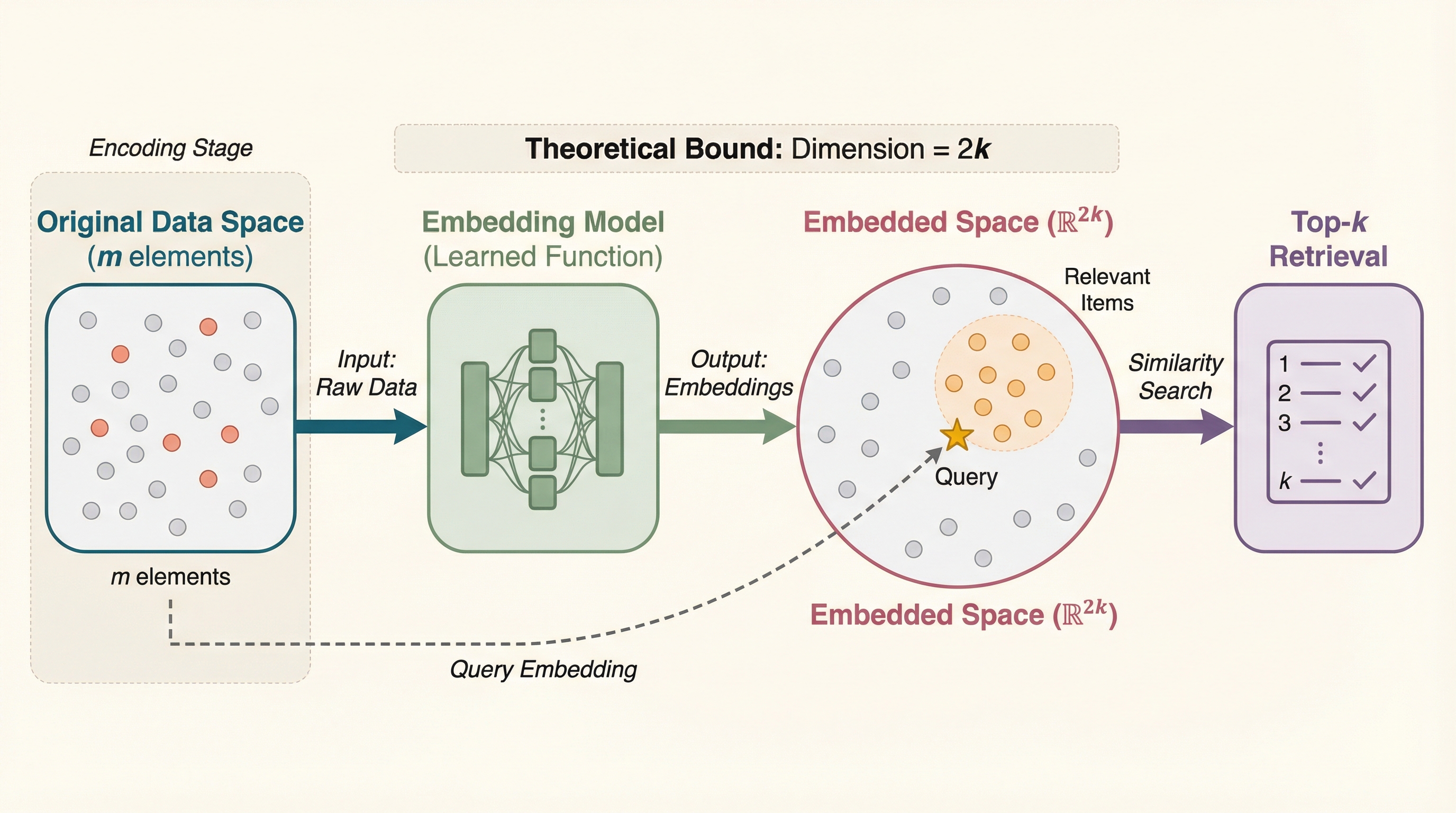 現代の情報検索や推薦システムにおいて、膨大なデータの中からクエリに適合する上位k個の要素を高速に抽出する手法として、要素をベクトル空間に埋め込む手法は不可欠な技術となっている。しかし、検索対象となる要素数mが数百万、数千万と増大し続ける中で、検索精度を維持するために必要な埋め込み次元dをどのように設定すべきかという問いは、長らく理論的な未解決問題であった。これまでの経験的な知見や一部の先行研究では、要素数mが増えるにつれて、必要な次元数も多項式的に増大させなければならないという予測がなされており、これが埋め込みベースの検索における幾何学的な限界であると広く信じられてきた。もしこの予測が正しければ、大規模なデータを扱うためには次元数を際限なく増やす必要があり、計算コストやメモリ使用量の増大という「次元の呪い」を避けることはできないことになる。…