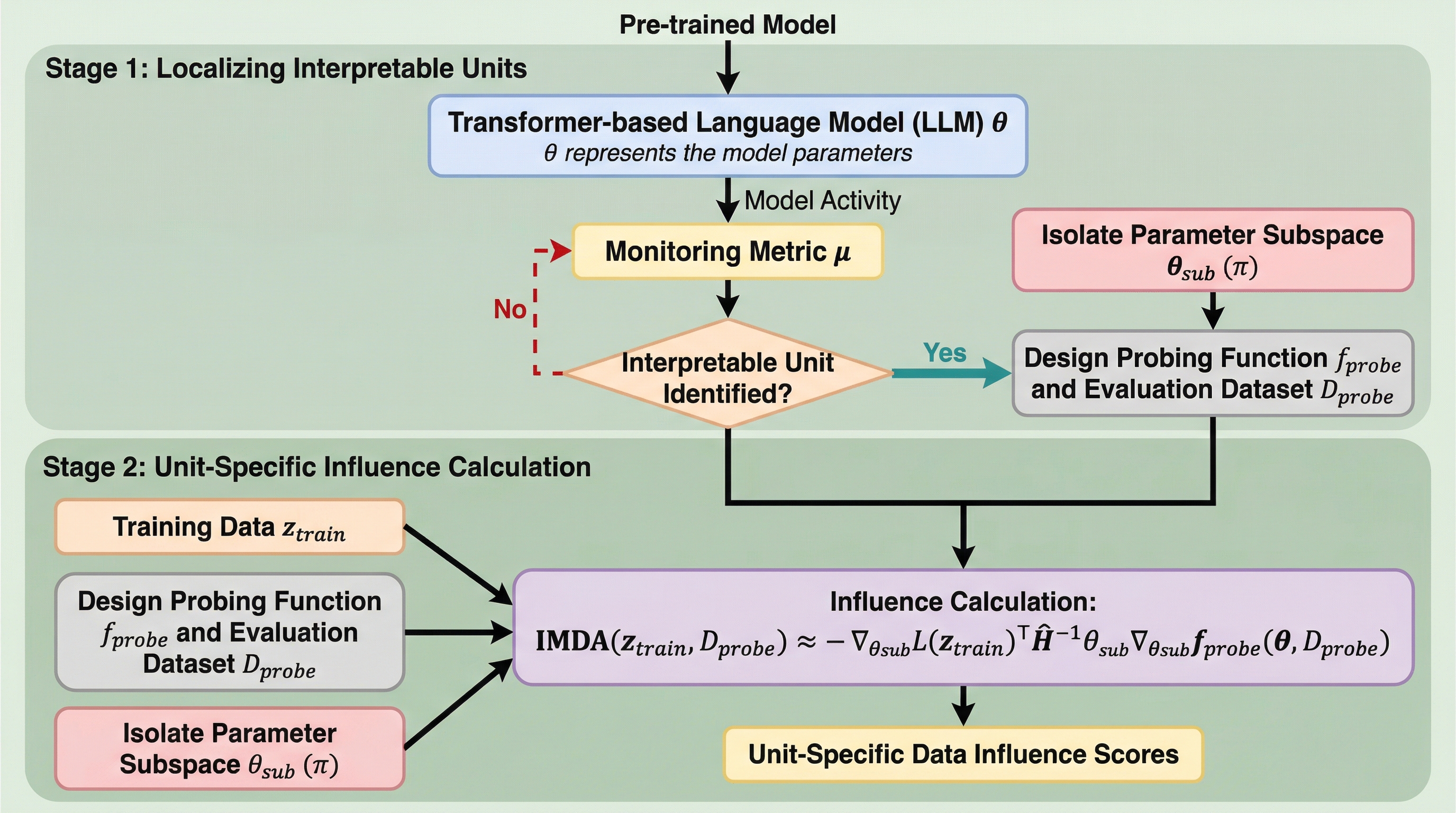 本研究では、解釈可能なLLMユニットの学習起源を特定するためのスケーラブルなフレームワークである「Mechanistic Data Attribution(MDA)」を提案しました。MDAは、従来の影響関数(Influence Functions)を拡張し、モデル全体の挙動ではなく、特定のニューロンやアテンションヘッド、SAE特徴量といった個別の機能ユニットの挙動をターゲットとして、学習サンプルの影響度を定量化します。MDAの核心は、特定のユニットの機能的有効性を評価するための「プローブ関数」を導入した点にあります。…