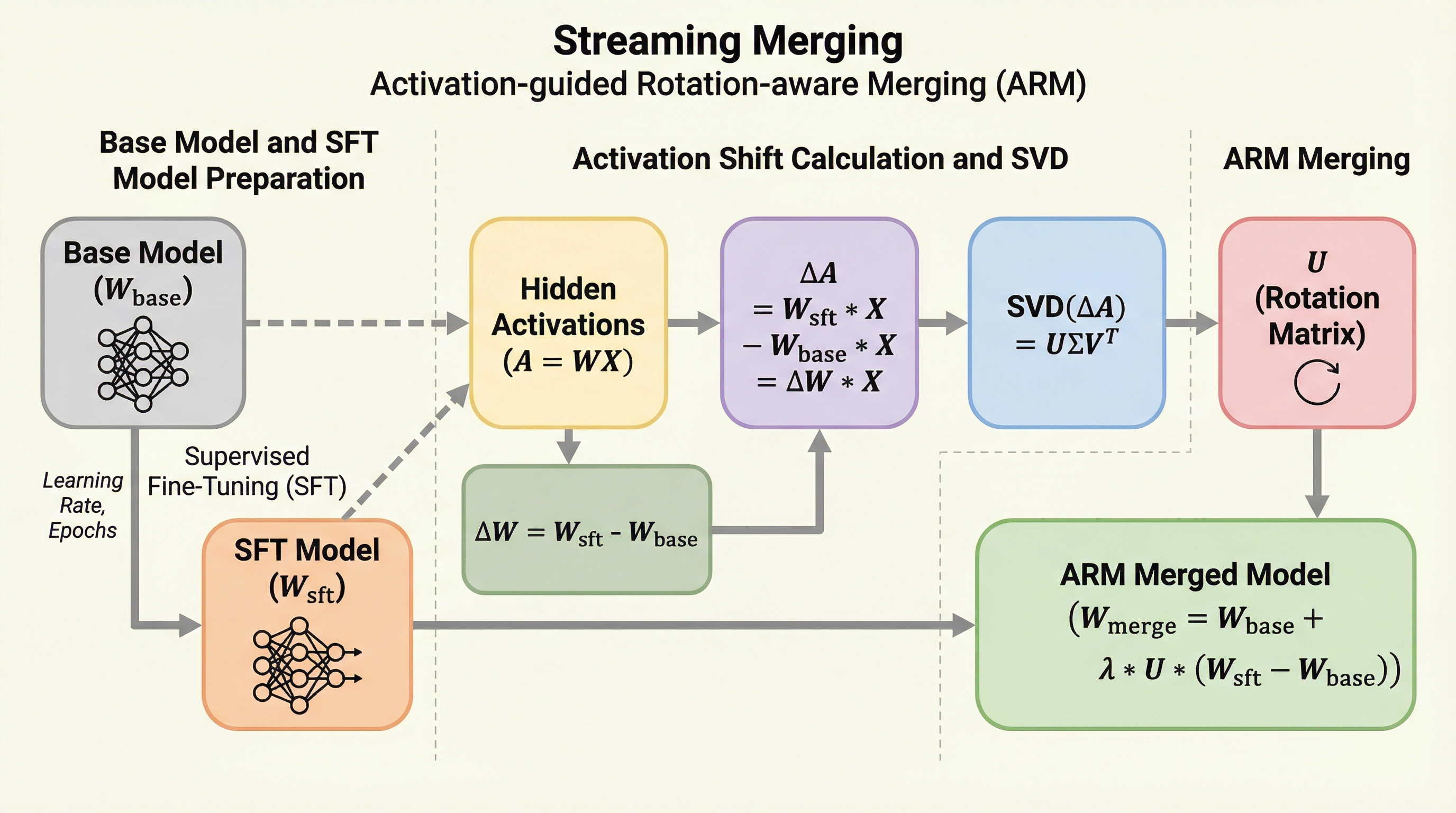 本研究の最大の貢献は、モデルマージを静的な統合手法から、反復的で幾何学的な構造を考慮した最適化プロセスへと再定義する「ストリーミング・マージ(Streaming Merging)」というパラダイムを提案したことです。この枠組みは、計算コストの高い再学習を行うことなく、少量のキャリブレーションデータと既存のチェックポイントのみを用いて、モデルを継続的に進化させることを可能にします。 このパラダイムを支える具体的なアルゴリズムが「ARM(Activation-guided Rotation-aware Merging)」です。ARMは、モデルの内部層で発生するアクティベーション(中間出力)の情報を活用して、パラメータの「回転」を制御します。具体的には、マージ係数を学習率のように扱い、アクティベーションの差分から導き出された回転ベクトルを用いて、パラメータの更新方向をデータ駆動型の軌跡に沿って精密に誘導します。…