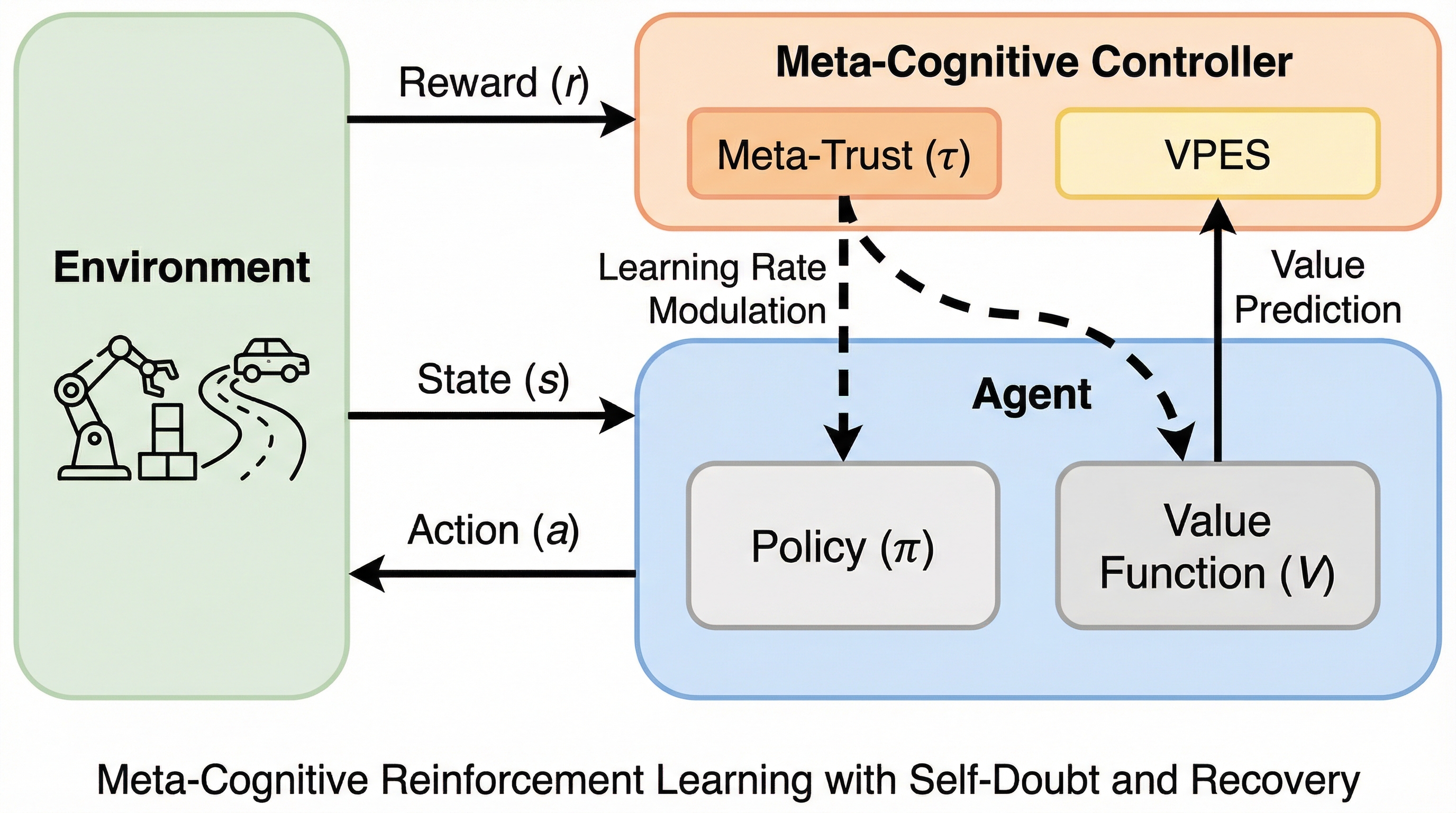 堅牢な強化学習手法は、通常、信頼性の低い経験や汚染された報酬の抑制に焦点を当てているが、自身の学習プロセスの信頼性について推論する能力を欠いている。その結果、これらの手法はノイズに対して過度に保守的になることで過剰反応するか、あるいは不確実性が蓄積した際に壊滅的な失敗を招くことが多い。本研究では、内部で推定された信頼性信号に基づいて、エージェントが自身の学習行動を評価、調整、および回復することを可能にするメタ認知的強化学習フレームワークを提案する。提案手法は、価値予測誤差安定性によって駆動されるメタ信頼変数を導入し、フェイルセーフ調整と段階的な信頼回復を通じて学習ダイナミクスを制御する。報酬汚染を伴う連続制御ベンチマークでの実験により、回復機能を備えたメタ認知的制御は、強力な堅牢性ベースラインと比較して、より高い平均リターンを達成し、学習終盤の失敗を大幅に減少させることが示された。 現実世界の複雑な環境に強化学習システムを導入する際、信頼性の低いフィードバックや非定常な環境変化、そして学習プロセス自体の不安定さが大きな障壁となっている。…