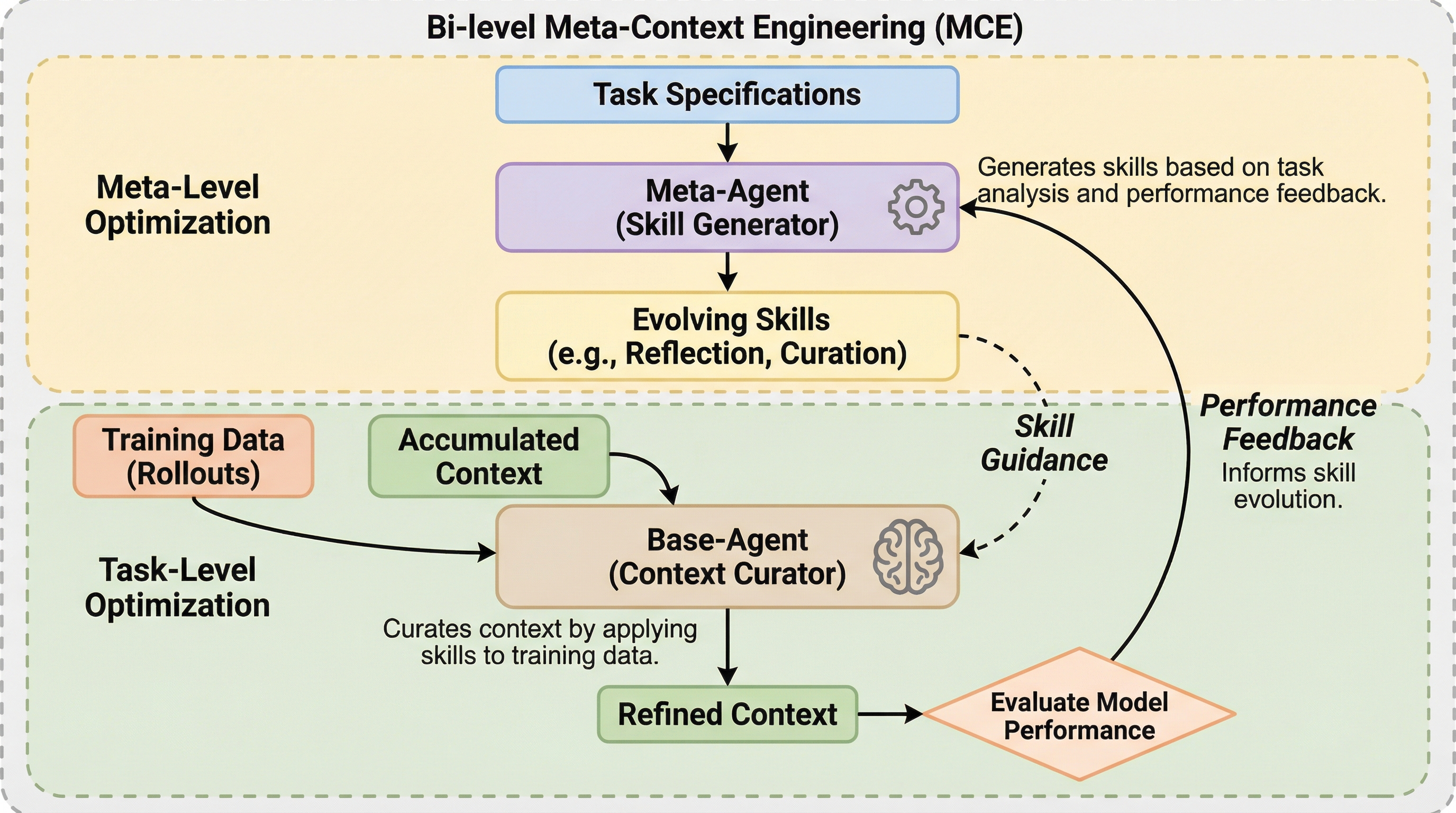 大規模言語モデル(LLM)の推論性能を最大化するため、文脈(コンテキスト)の構成方法そのものをAIエージェントに自律進化させる二段階の最適化フレームワーク「Meta Context Engineering(MCE)」が提案されました。
