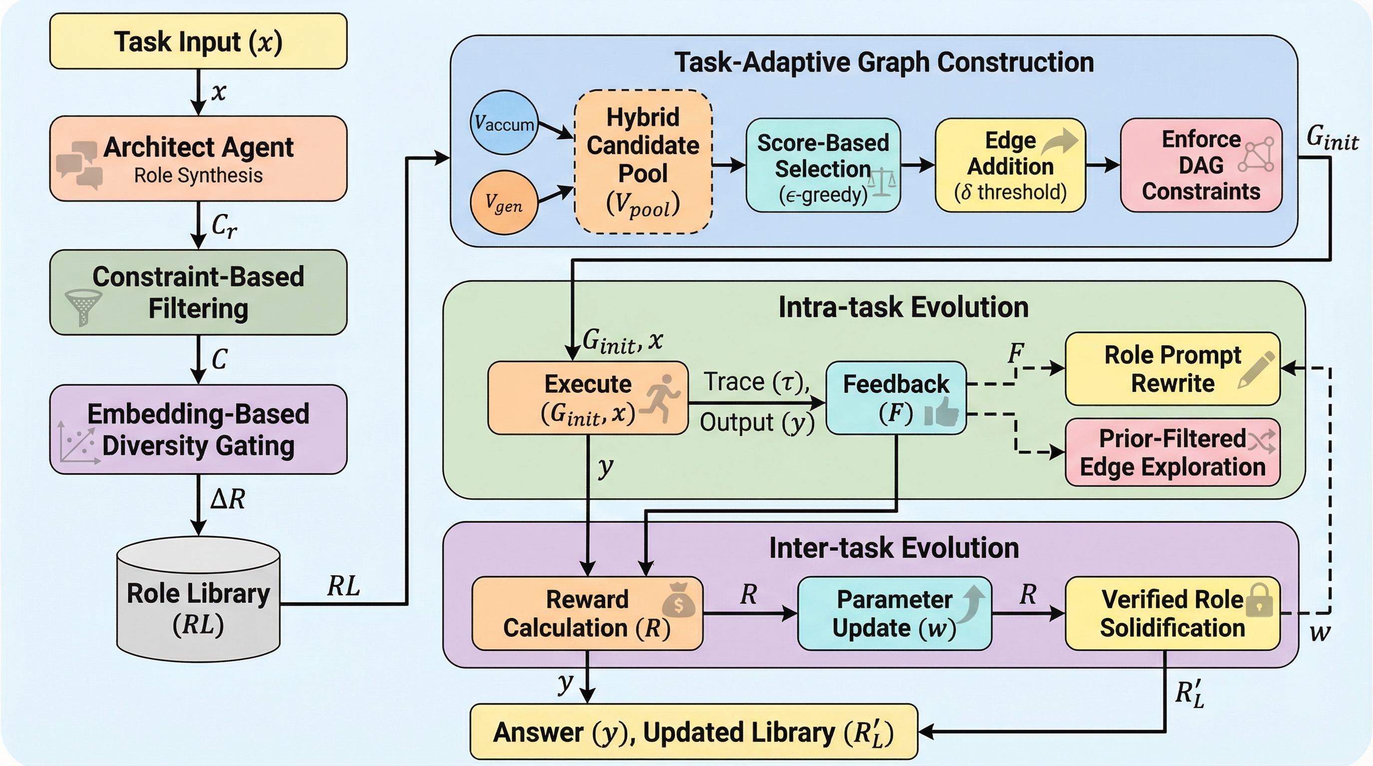 本論文では、推論時に役割空間と協力トポロジーの両方を適応させる、トレーニングフリー(追加学習不要)なフレームワーク「MetaGen」を提案している。MetaGenの核心は、入力されたクエリを条件として、そのタスクに最適な役割の仕様を合成・修正する「アーキテクト(Architect)」エージェントを導入したことにある。このシステムは、従来の固定的な役割ライブラリに縛られることなく、実行時に制御可能な動的役割プールを維持し、タスクの要求に応じてエージェントの定義そのものを書き換えることができる。 MetaGenは、最小限の機能を持つバックボーン(骨格)となる構造を中心に初期実行グラフを構築し、実行中に得られる軽量なフィードバック信号を用いて、役割のプロンプトや構造的な決定を反復的に更新する。このプロセスにおいて、バックボーンとなるLLMの重みは一切変更されない。…