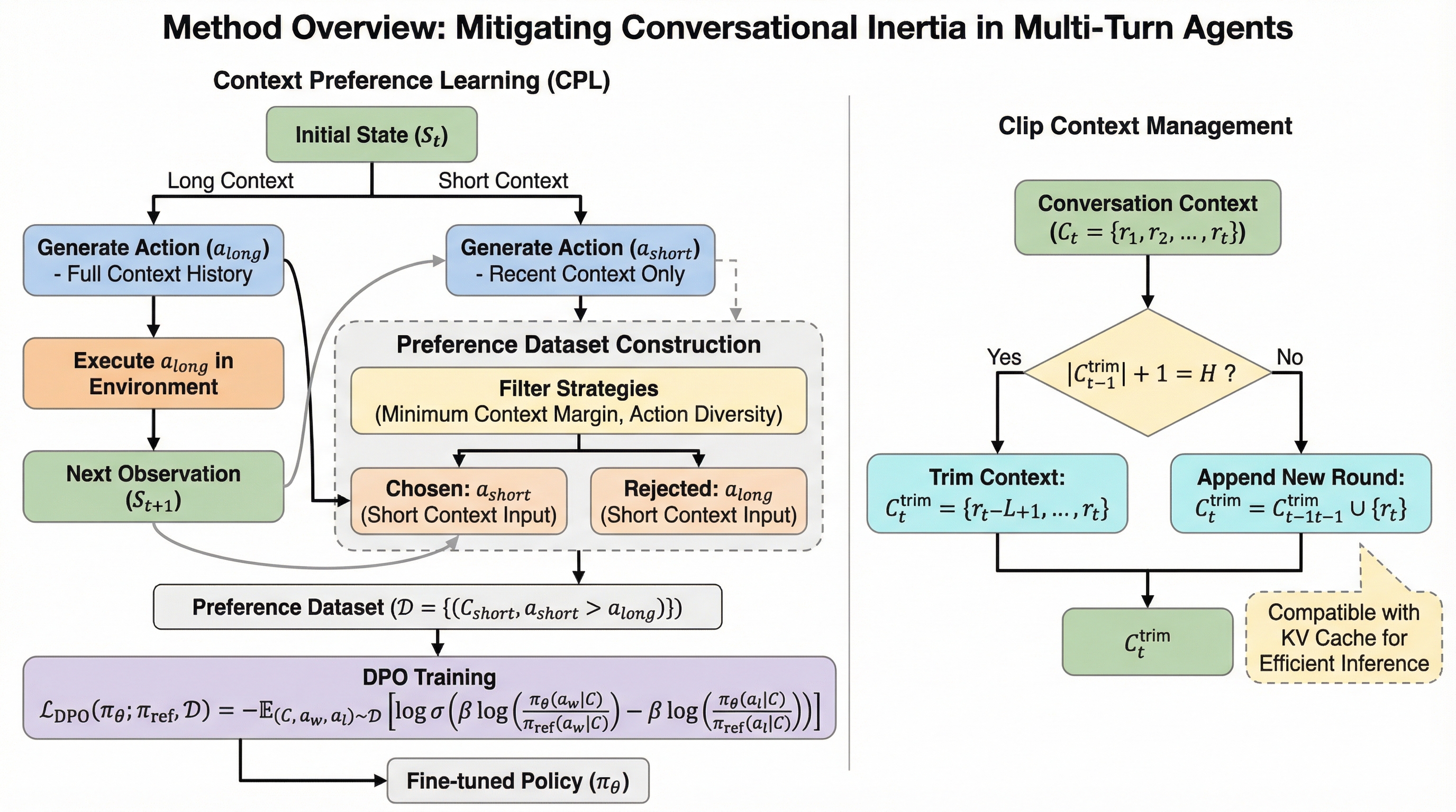 大規模言語モデル(LLM)をマルチターンエージェントとして利用する際、過去の自身の回答を過度に模倣して探索を阻害する「会話の慣性(Conversational Inertia)」という現象が特定されました。 この問題を解決するため、環境からの報酬を必要とせずに短文と長文のコンテキストの差を利用してモデルの好みを調整する「Context Preference Learning(CPL)」と、推論時に履歴を定期的に整理する「Clip Context」が提案されました。 実験の結果、8つのエージェント環境と深層調査シナリオにおいて、提案手法は対角線上のアテンション(慣性)を大幅に減少させ、既存のウィンドウ方式や要約方式を上回る性能向上を達成し、計算効率の改善も実現しました。