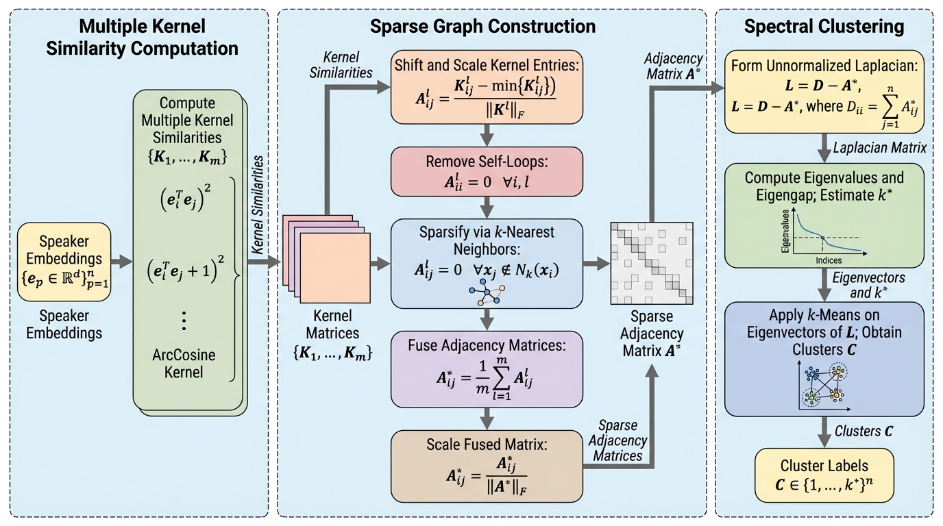 本研究の核心的な提案は、複数の異なるカーネル関数を用いて話者埋め込み間の類似性を多面的に測定し、それらを統合して「疎なグラフ(スパースグラフ)」を構築する「MK-SGC-SC」という新しい枠組みである。単一の類似度指標(例えばコサイン類似度など)に依存するのではなく、複数のカーネルを組み合わせることで、話者間の微妙な特徴の差や共通性をより頑健に捉えることが可能になる。 具体的には、話者埋め込みの類似性を評価するために、定数項や次数が異なる4種類の多項式カーネルと、角度情報に基づく1種類の1次アークコサインカーネルを採用している。…