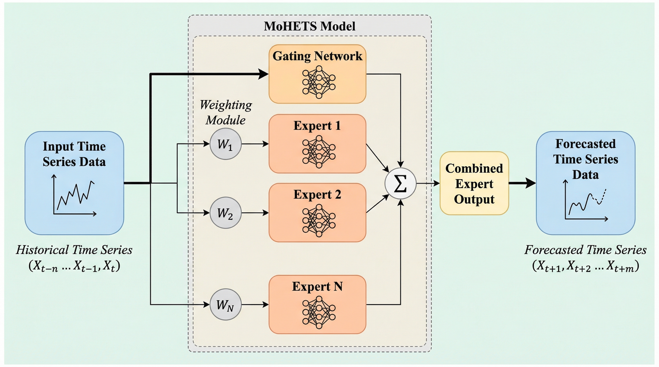 MoHETSは、多変量時系列データの複雑な多スケール構造を捉えるために、構造の異なる専門家ネットワークを組み合わせた「異種混合エキスパート(MoHE)」を導入したエンコーダーのみのTransformerモデルである。