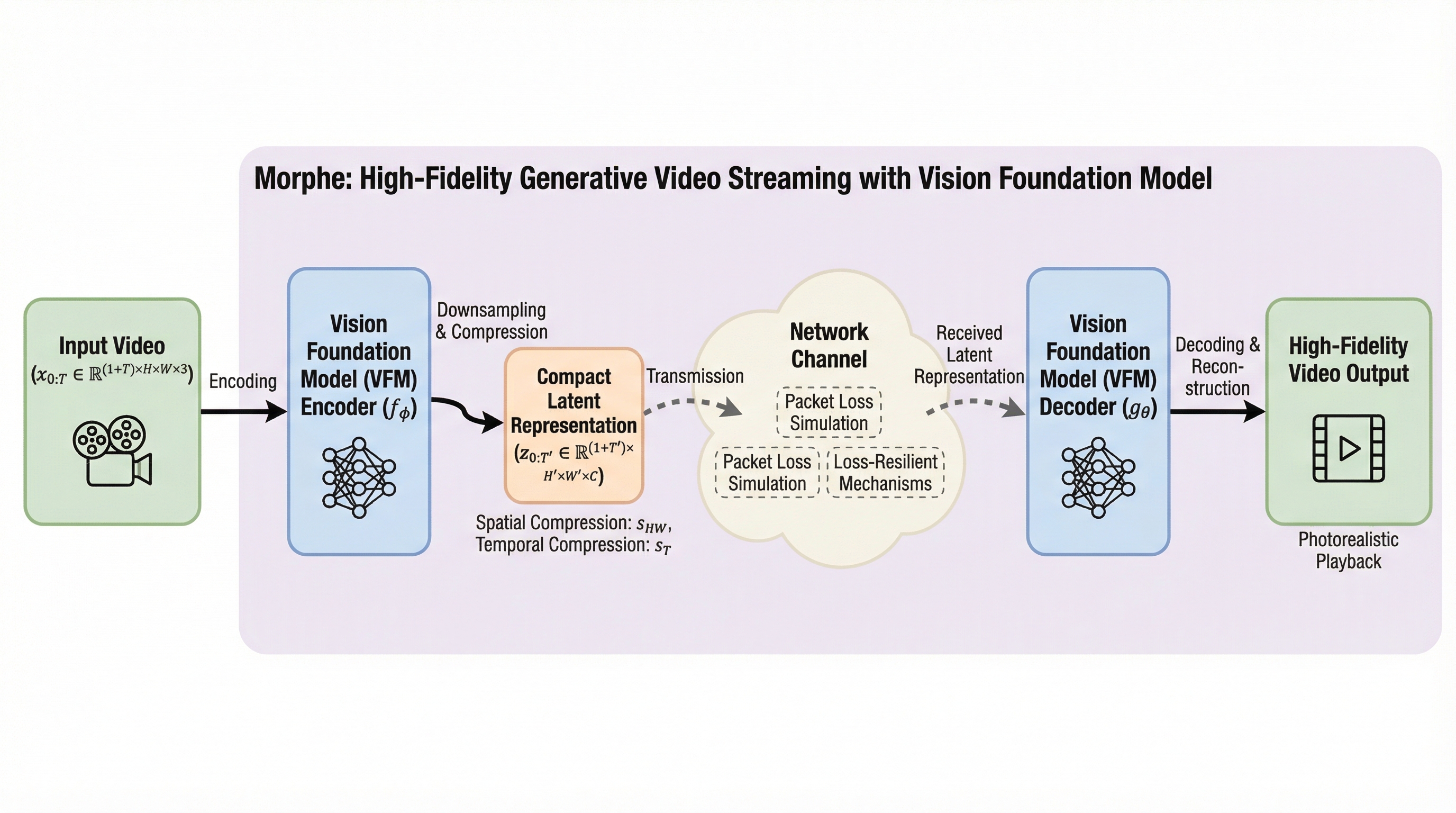 本研究では、視覚基盤モデル(VFM)の能力を最大限に引き出し、高忠実度、低遅延、かつパケットロスに強いビデオ配信を実現するエンドツーエンドのシステム「Morphe」を提案しました。Morpheという名称は、形を形作るギリシャの神に由来しており、高度に圧縮された潜在的な特徴から高忠実度な映像をインテリジェントに再構成するというシステムの核となる機能を象徴しています。このシステムは、従来のピクセルベースの圧縮限界を打破し、意味レベルでの情報伝送を行うことで、極めて低い帯域幅でも高品質な視聴体験を提供することを目指しています。 Morpheの設計は、主に3つの革新的なコンポーネントで構成されています。…