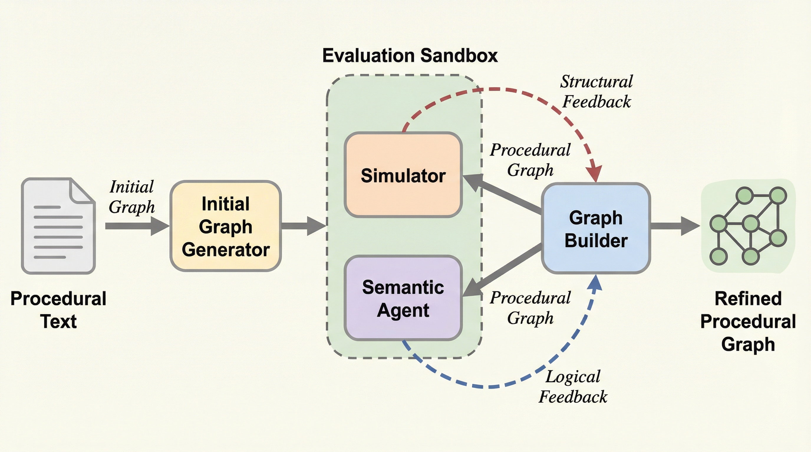 自然言語からワークフローを抽出する際、従来の大型言語モデルでは構造的な不備や論理的な誤解が生じやすいという課題に対し、本研究ではグラフ構築、構造シミュレーション、論理整合性確認の3段階を繰り返すマルチエージェントフレームワーク「text2flow」を提案しました。 この手法は、シミュレーションによる実行経路の検証と原文との意味的な照合を組み合わせ、外部フィードバックに基づく反復的な推論プロセスを導入することで、追加の学習を必要とせずにグラフの構造的正確性と論理的一貫性を大幅に向上させることに成功しました。 具体的には、シミュレーションで検出された実行不可能な経路や、原文の条件と矛盾するゲートウェイ設定を自然言語のフィードバックとしてモデルに返し、優先順位付けされた修正指示を通じて、複雑な非線形構造を持つ手続き型グラフを高い信頼性で生成することを可能にしました。