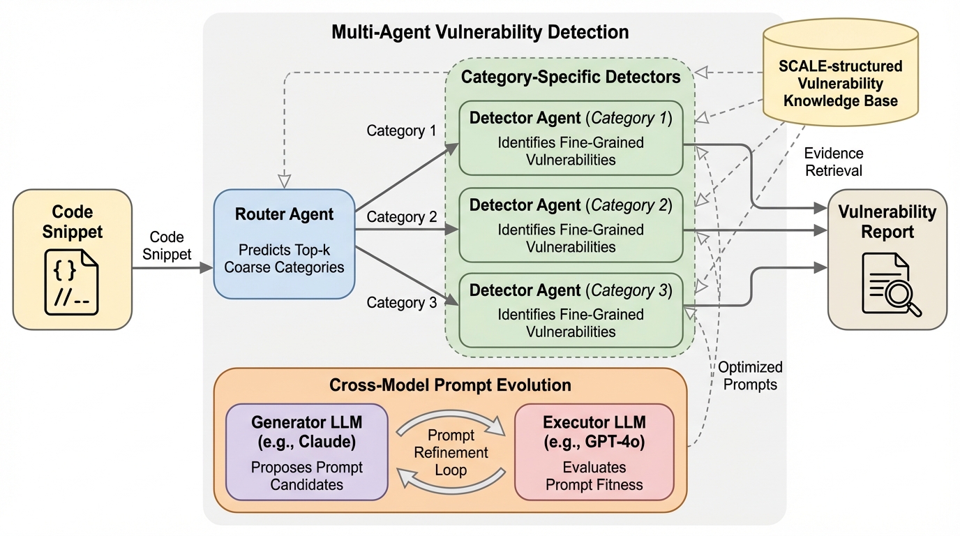 本論文では、検索拡張型マルチエージェント枠組みである「MulVul」を提案しています。この枠組みの核心は、粗い粒度から細かい粒度へと段階的に検知を進める「Router-Detector」アーキテクチャと、プロンプト最適化を自動化する「クロスモデル・プロンプト進化(Cross-Model Prompt Evolution)」にあります。MulVulは、まずルーターエージェントが入力コードに対して上位k個の粗い脆弱性カテゴリを予測し、その後、該当するカテゴリに特化したデテクターエージェントのみを呼び出すという戦略を採ります。これにより、すべての脆弱性タイプに対してエージェントを起動する計算負荷を避けつつ、高い網羅性を維持しています。…
