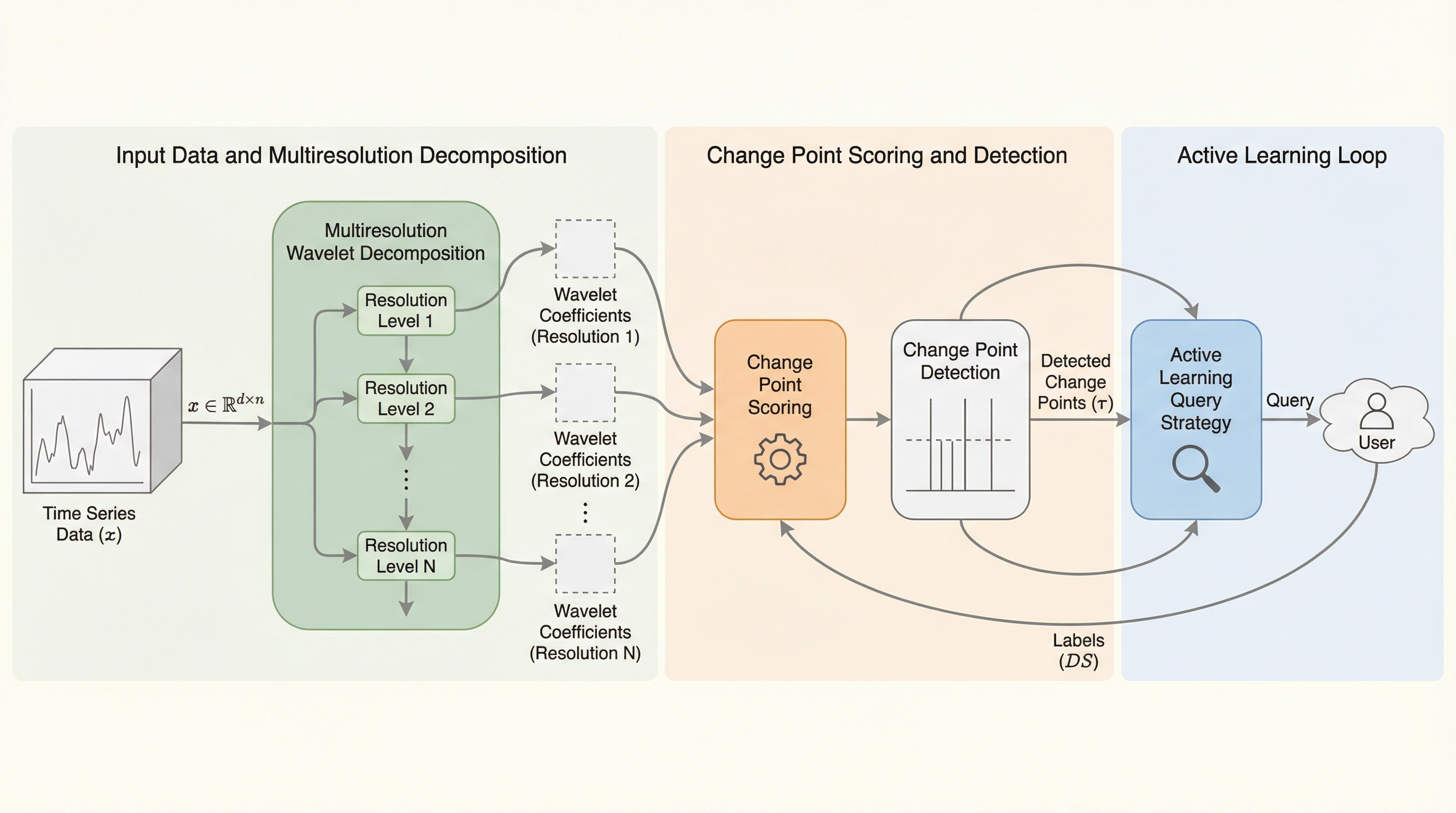 本論文では、マルチ解像度変化点検知アルゴリズムである「MuR-CPD」を基盤とし、そこに能動学習を組み込んだ「MuRAL-CPD」を提案しています。この手法の核心は、ウェーブレット変換による多角的な視点でのデータ解析と、ユーザーとの対話を通じたハイパーパラメータの最適化を一つの統合されたパイプラインで実現した点にあります。MuR-CPDは、ウェーブレット分解を用いて時系列データを異なる周波数帯域(サブバンド)に分割し、急激な変化から緩やかな変化まで、複数の時間スケールで変化点を捉えることができます。これにより、単一の解像度では見逃されがちな微細な構造の変化も検知可能となります。 さらに、MuRAL-CPDは、この教師なしのバックボーンに能動学習ループを直接埋め込んでいます。具体的には、ユーザーからの最小限のフィードバックを利用して、各解像度の特徴量の重みや検知の閾値を動的に調整します。…