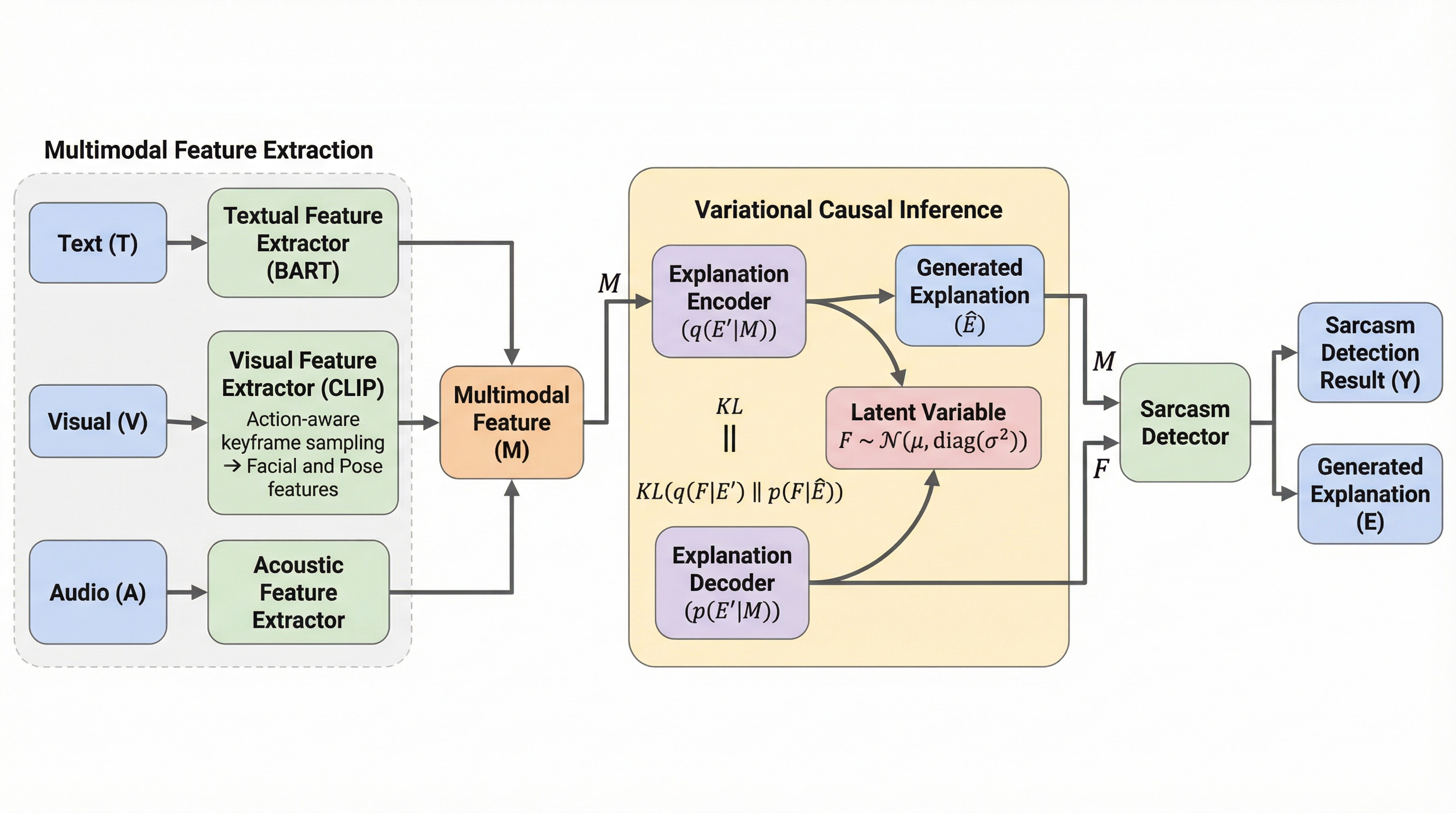 本研究では、人間の皮肉理解における認知メカニズムに触発され、変分因果推論に基づくマルチモーダル皮肉理解フレームワーク「MuVaC」を提案した。このフレームワークの核心的なアイデアは、説明から検出へと至る因果経路を確立することで、人間の認知プロセスをエミュレートすることにある。従来の相関ベースの学習から明示的な因果モデリングへとパラダイムをシフトさせることで、より知的で信頼性の高いシステムの構築を目指している。具体的には、まずMSDとMuSEを構造的因果モデル(SCM)の観点からモデル化し、共同最適化のための目的関数を定義する変分因果経路を構築した。 推論時には正解となる説明データが利用できないという制約があるため、潜在変数を取り入れた深い変分推論フレームワークへと定式化し直すことで、検出と説明の間の因果的な関連性と一貫性を確保しながら共同最適化を可能にしている。…