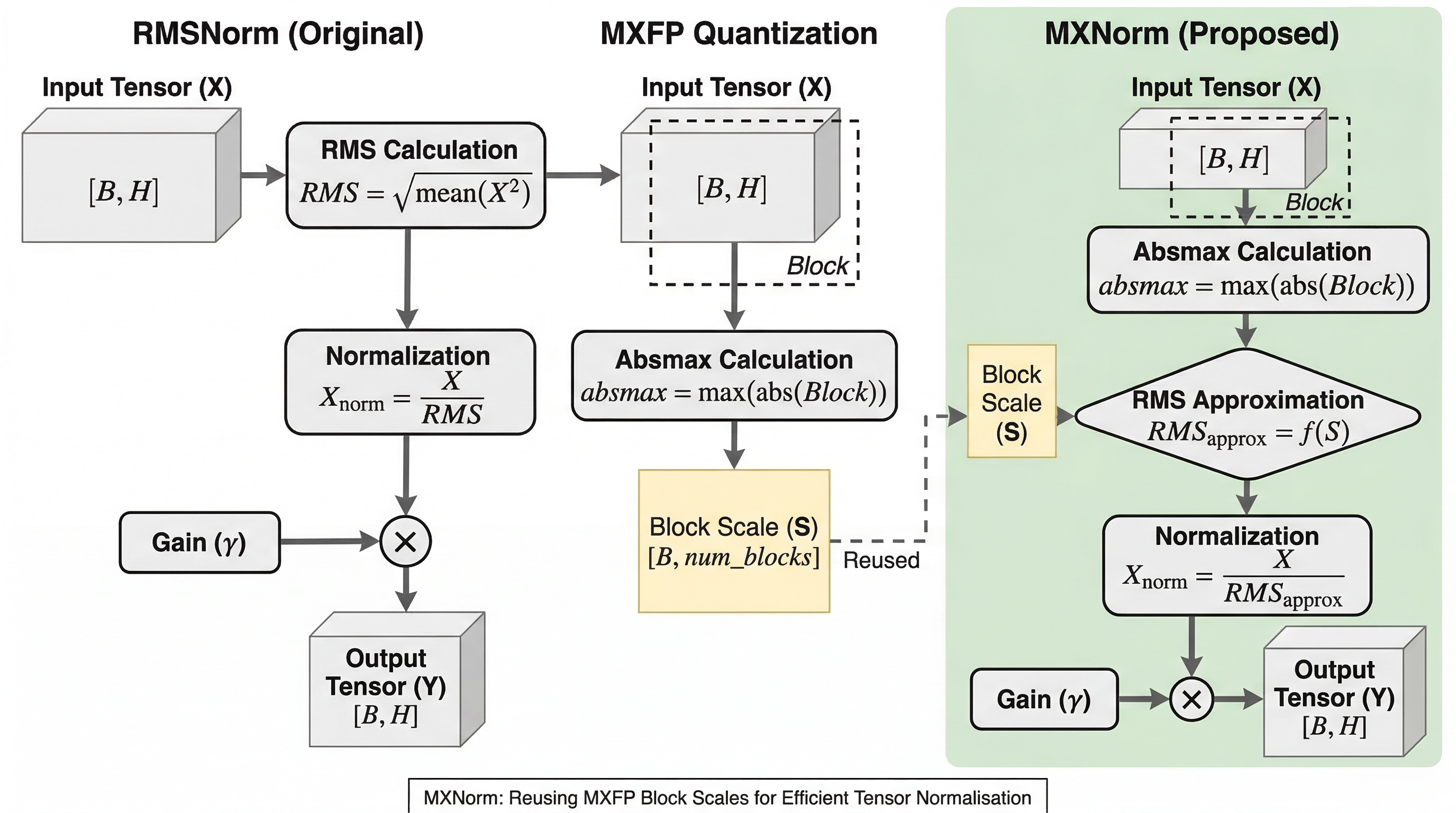 提案の中心はMXNormです。RMSNormを完全に捨てるのではなく、MXFP量子化で既に得られるブロックスケールを使ってRMSを近似し、Normと量子化を一体化してしまう正規化方式です。論文では、特に Pre-Norm Transformer における「RMSNormの直後に線形層、その前後でMX形式への変換が入る」というパターンに注目しています。この並びでは、正規化と量子化が hidden dimension に沿って別々に統計を取るため、そこをまとめる余地があります。