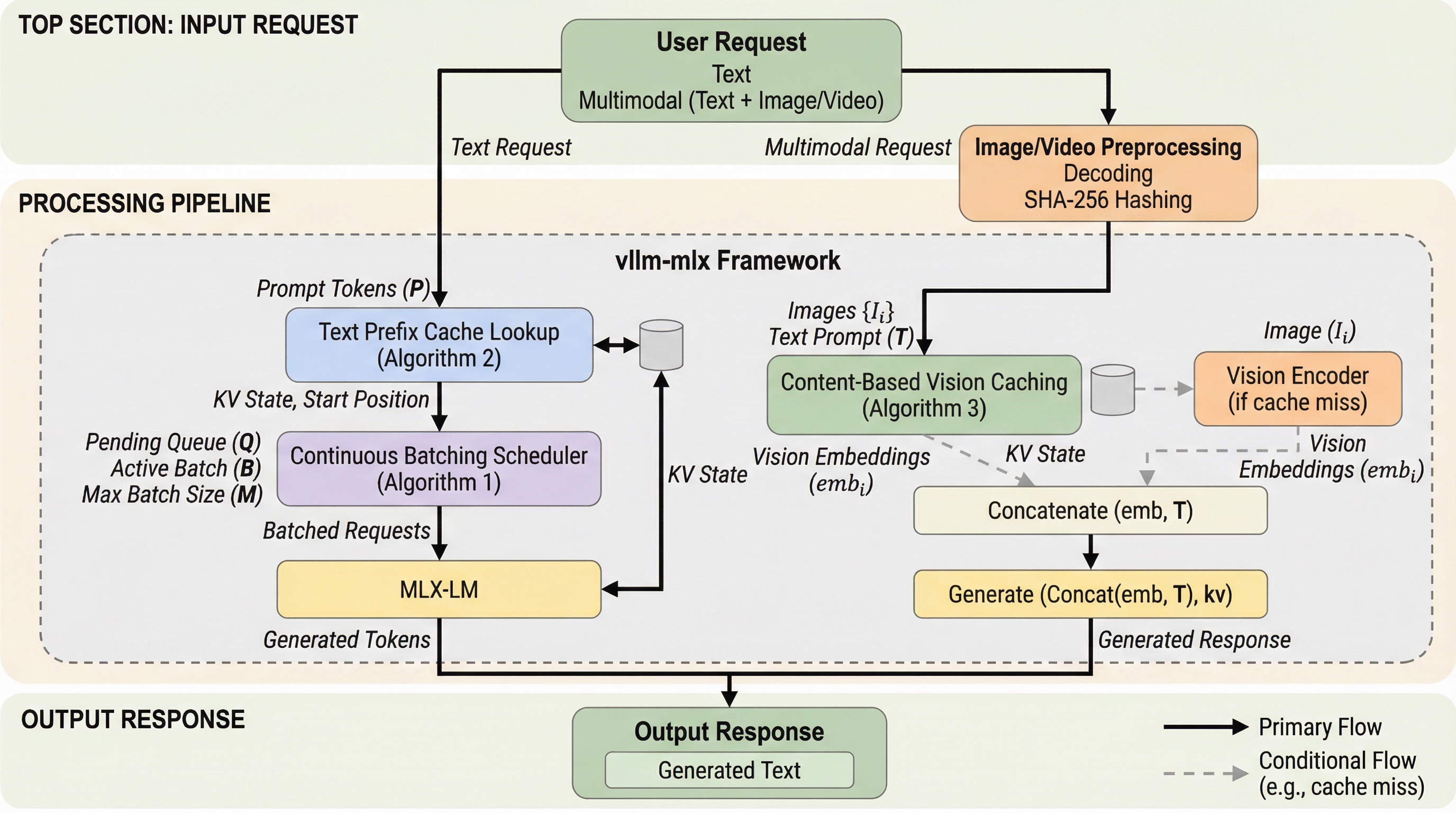 本研究では、Appleシリコン上での効率的な推論を実現するために、Apple独自のMLXフレームワークを基盤としてネイティブに構築された新しいシステム「vllm-mlx」を提案した。このフレームワークは、統合メモリ構造を最大限に活用してゼロコピー操作を実現し、主に二つの画期的な機能を提供している。第一に、テキストモデルに対して継続的バッチ処理を導入したことである。これにより、複数の同時リクエストを動的にグループ化し、llama.cppなどの既存手法を大幅に上回る集計スループットを達成した。第二に、マルチモーダルモデル向けに導入された「コンテンツベースのプレフィックスキャッシュ」である。 このキャッシュ機構は、入力された画像がURL、Base64文字列、あるいはファイルパスのいずれの形式であっても、デコードされたピクセル値からSHA-256ハッシュを計算することで同一の画像を確実に識別する。…