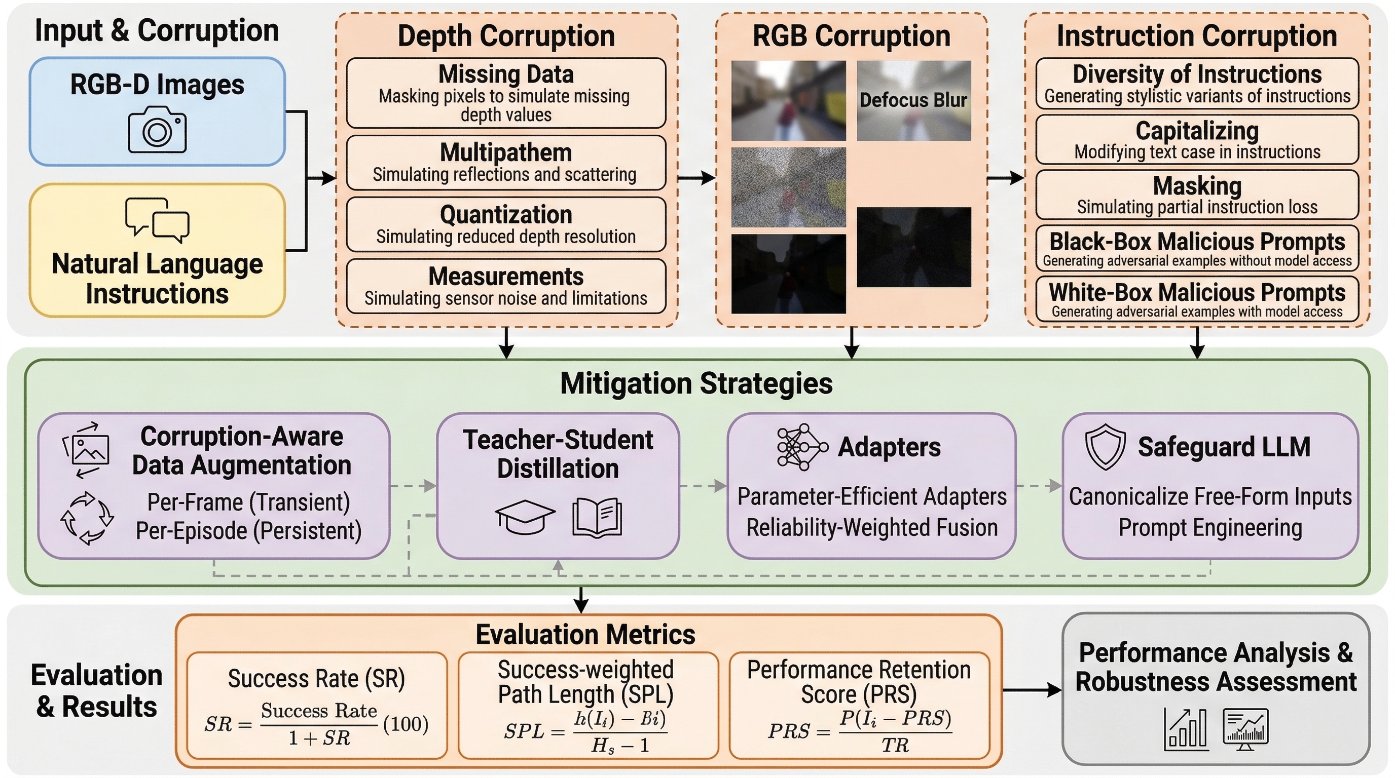提案は単一の新モデルではなく、評価基盤と分析手順のセットです。第一に、視覚と言語によるナビゲーションと物体目標ナビゲーションを横断して使える統一ベンチマークを作った。第二に、RGB、深度、指示文の三系統の破損を、実世界のノイズに近い形で整理した。第三に、壊れ方を見るだけで終わらせず、四種類の緩和策まで比較した。第四に、シミュレータ上の結果だけではなく、実ロボットまで使って改善が再現するかを確認した、という四段構えです。