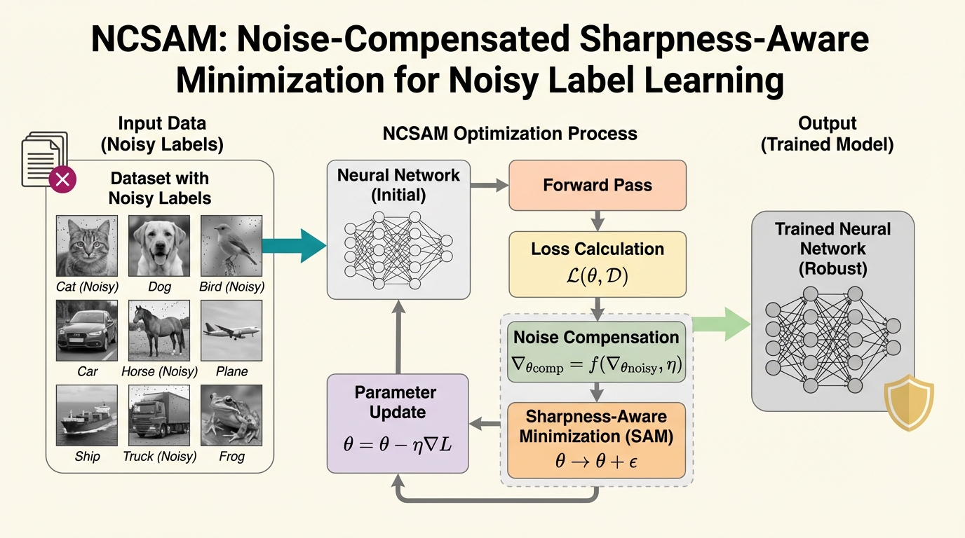 本論文では、ノイズラベル学習の課題に対して、最適化の観点から新しい理論的アプローチを提案しています。具体的には、PAC-Bayes学習フレームワークを用いて、ラベルノイズと損失関数の平坦性の間の根本的な関係を理論的に解析しました。この解析を通じて、適切にシミュレートされたラベルノイズが、実は汎化性能とノイズに対する堅牢性の両方を相乗的に高める可能性があることを示しました。この理論的洞察に基づき提案されたのが、NCSAM(Noise-Compensated Sharpness-Aware Minimization)です。NCSAMの核心は、従来のSAMが持つパラメータ摂動の仕組みを利用しつつ、ノイズによって生じる勾配の歪みを明示的に補償することにあります。従来の平坦化手法がノイズ環境下で最適ではない理由として、ノイズに起因する勾配のバイアスとパラメータ摂動の方向が不一致を起こしていることを突き止めました。…