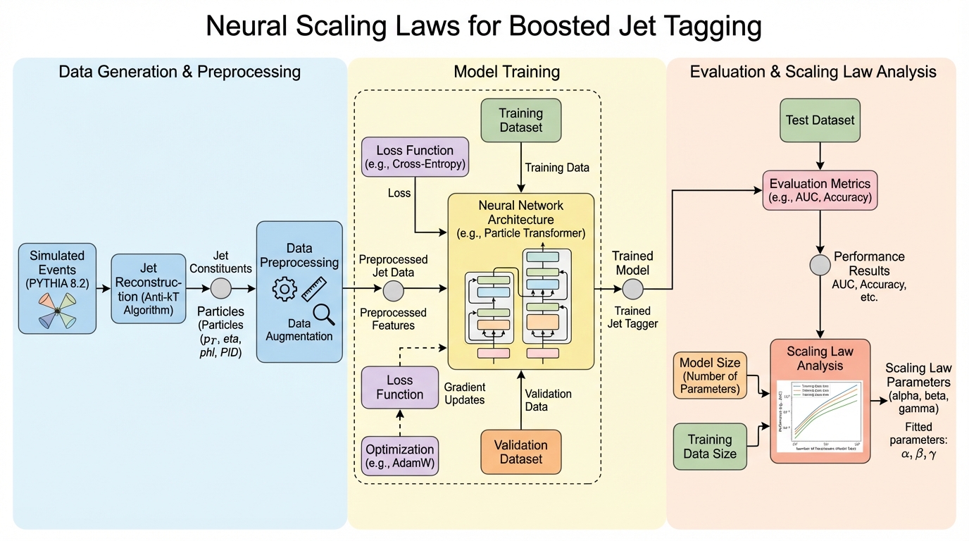 公開データセットJetClassのブーストジェット分類で、モデルのパラメータ数と学習データ数を同時に増やして学習計算量を拡張すると、検証損失が不可約損失と呼ぶ到達限界へ一貫して近づくことを、スケーリング則として整理しています。