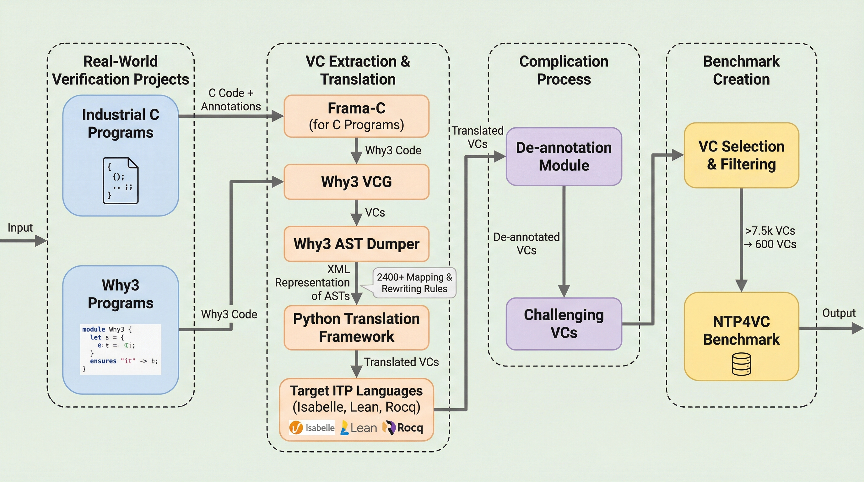 ソフトウェアの信頼性を数学的に保証するプログラム検証において、最大の難所である「検証条件(VC)」の自動証明を解決するため、機械学習を用いたニューラル定理証明(NTP)を実世界の複雑なコードに適用する初のベンチマーク「NTP4VC」を構築した。 LinuxカーネルやContiki-OSといった産業規模のプロジェクトから、Why3やFrama-Cなどの既存ツールを用いてVCを抽出し、専門家が作成した2400以上の規則に基づき、論理的な意味を保持したままIsabelle、Lean、Rocqの各形式言語へ自動翻訳する高信頼なパイプラインを実現した。 最新の言語モデルや定理証明に特化したモデルを用いて評価した結果、成功率は最高でも約2%に留まり、既存の自動定理証明器(ATP)が苦手とする複雑な論理問題に対して、現在のAI技術には依然として巨大な課題と研究の余地があることが浮き彫りになった。
