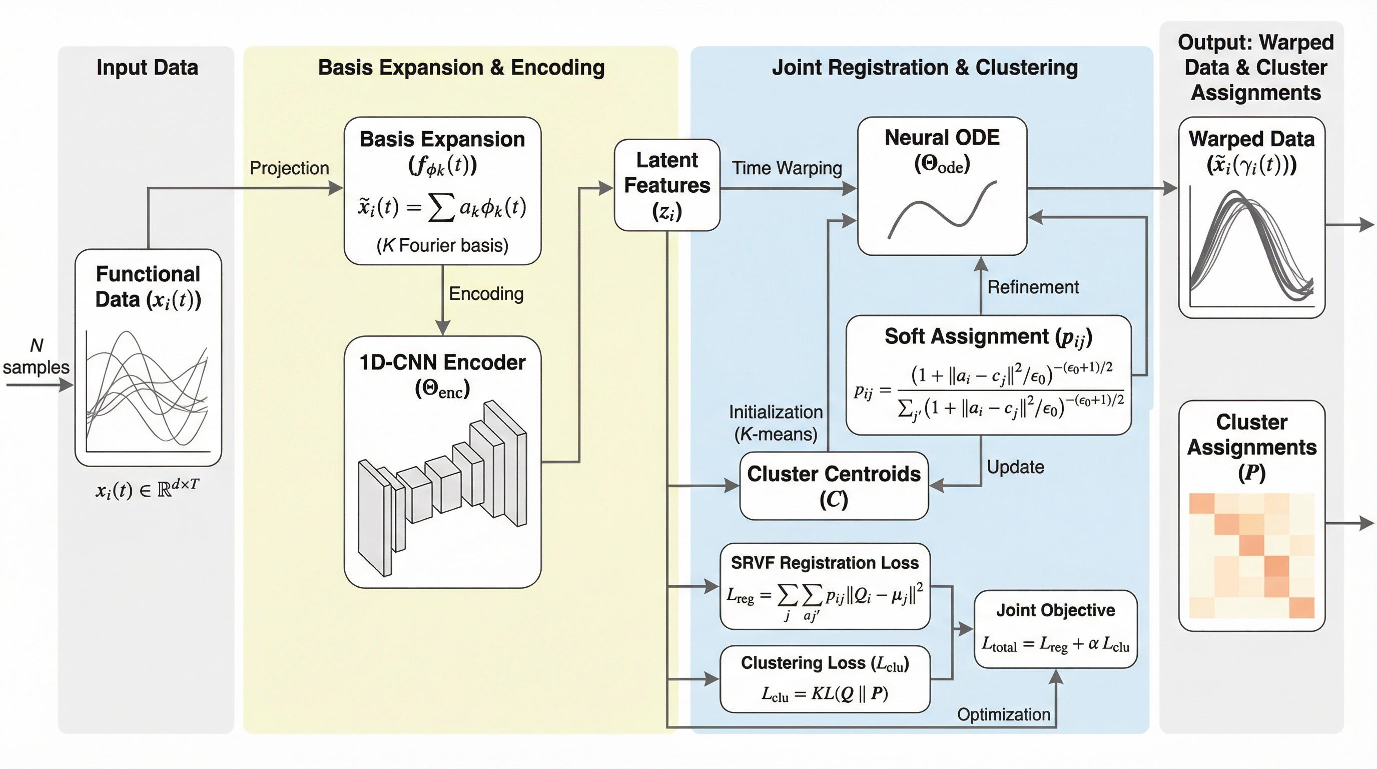 NeuralFLoCは、時間的なずれ(位相変動)を伴う関数データを高精度に分類するために開発された、完全教師なしの深層学習フレームワークである。Neural ODE(神経常微分方程式)を活用して滑らかで逆変換可能な微分同相の時間歪み関数を学習し、スペクトルクラスタリングと統合することで、データの位置合わせとグループ化を同時に最適化する。従来の段階的な手法や制約の強いモデルとは異なり、欠損値やノイズに対する堅牢性を備えつつ、大規模なデータセットに対しても線形時間での計算スケーラビリティを実現している。