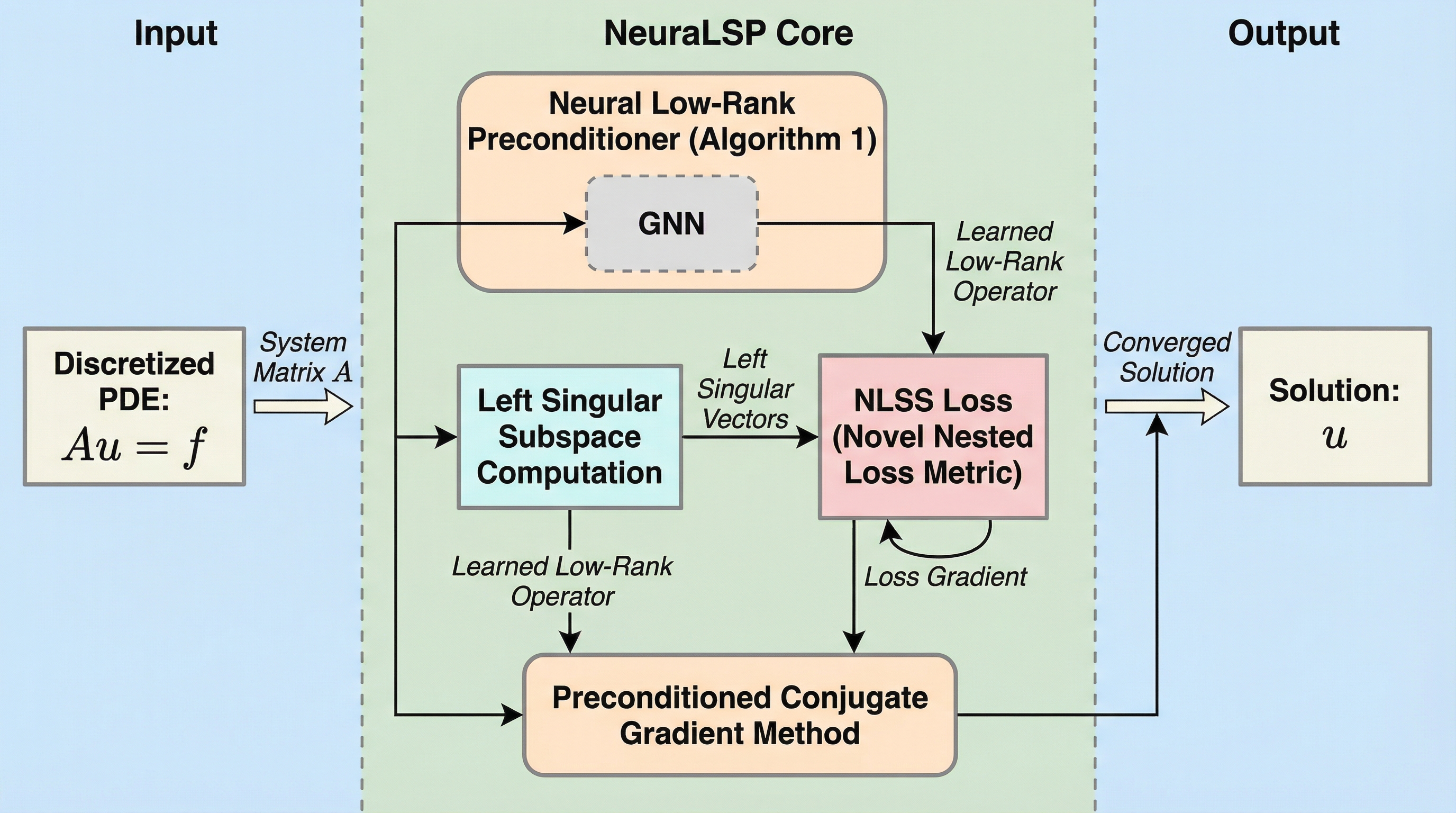 本論文では、システム行列の近零空間ベクトルの左特異部分空間を活用する、新しいニューラルプリコンディショナ「NeuraLSP」を提案しており、これは数学的な厳密さと機械学習の柔軟性を統合した画期的なパイプラインです。 NeuraLSPの最大の特徴は、学習された左特異ベクトルを使用して固定の低ランクプリコンディショナを構築する点にあり、スペクトル情報を固定の低ランク演算子に圧縮することで、理論的な保証とランク膨張に対する経験的な頑健性の両立を実現しています。 この手法の中核をなすのは、新しく定式化された「ニューラル左特異部分空間(NLSS)損失関数」であり、これはシステム行列の近零空間ベクトルの主要な左特異部分空間を効率的に復元するように設計されています。…