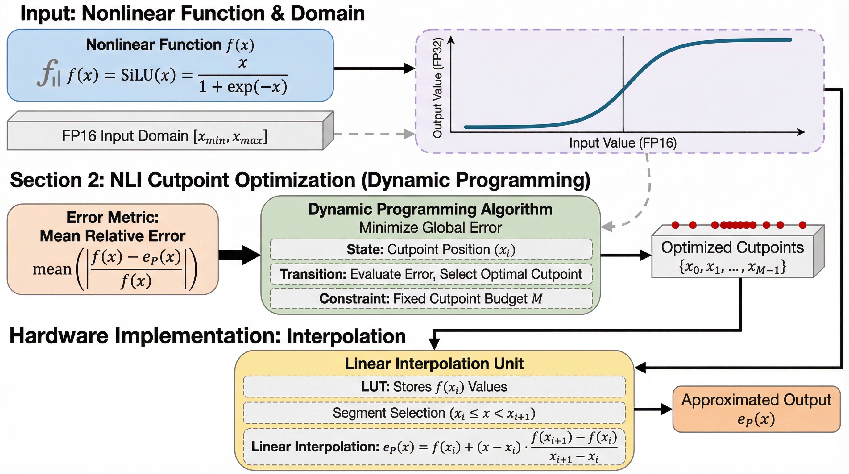 本論文では、較正不要で動的計画法による最適化を適用した、ハードウェア親和性の高いフレームワーク「非一様線形補間(NLI)」を提案している。このフレームワークは、ソフトウェア側の「NLI-Algorithm」とハードウェア側の「NLI-Engine」の2つの主要コンポーネントで構成されている。NLIの核心的なアイデアは、非線形関数の評価をFP16ドメインにおける非一様な線形補間に置き換えることにある。従来の等間隔なサンプリングとは異なり、関数の曲率や計算精度を考慮して、誤差を最小化するように区切り点(カットポイント)を戦略的に配置する。…