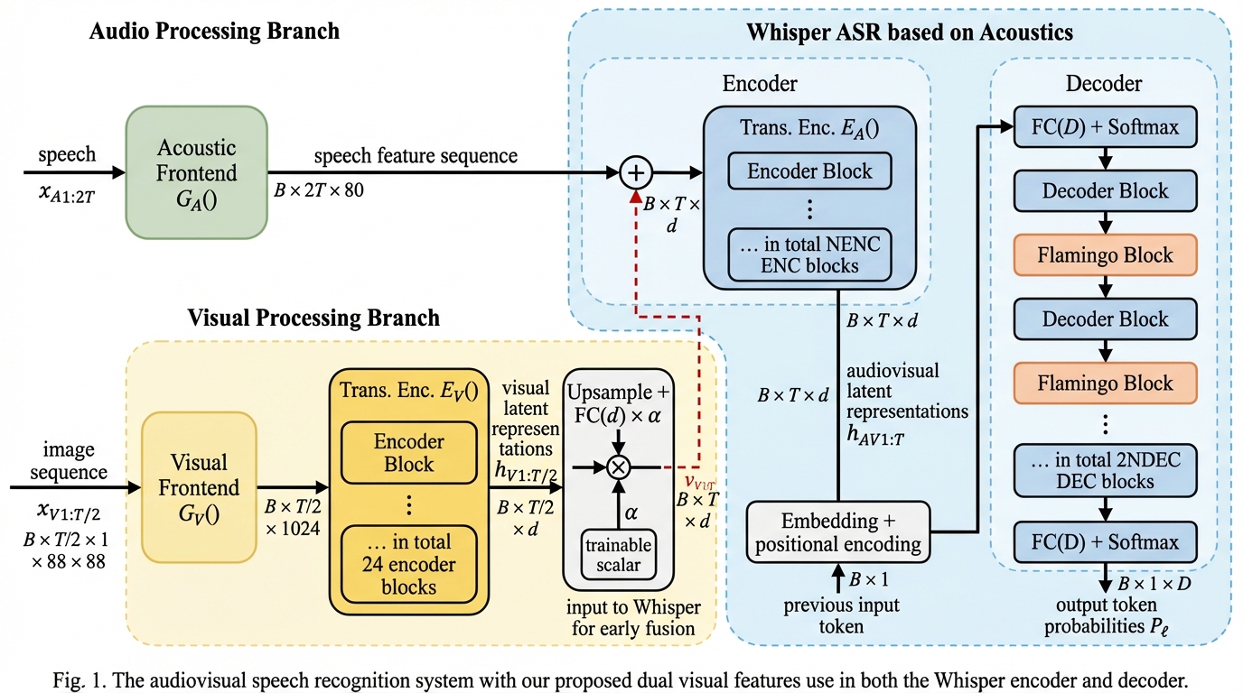 本研究は、Whisper ASRの騒音耐性を劇的に向上させるため、視覚的特徴量をエンコーダとデコーダの両方に統合する「デュアルユース」手法を提案し、従来の融合手法が抱えていた学習の不安定さや相互作用の欠如という課題を解決した。