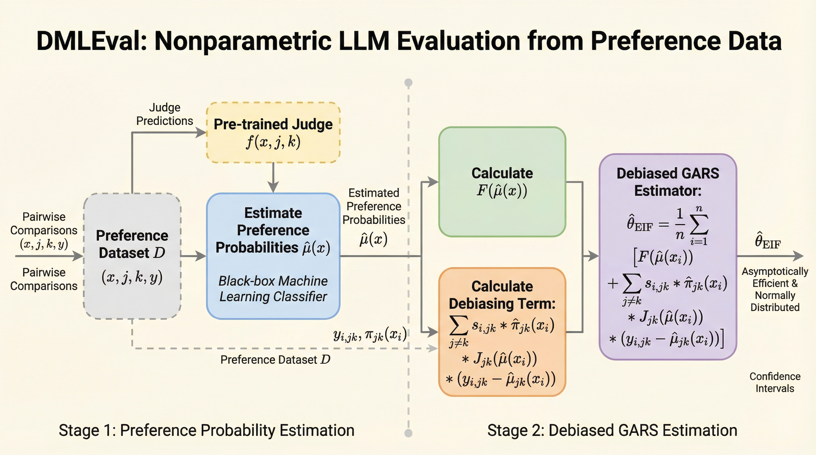 従来のLLM評価はBradley-Terryモデルなどのパラメトリックな手法に依存しており、モデルの誤設定によるバイアスの発生や、複雑な機械学習モデルを用いた際の不確実性の定量化が困難であるという課題があった。 本研究が提案する「DMLRANK」は、デバイアス機械学習(DML)を活用したノンパラメトリックな統計的枠組みであり、勝率やランク・セントラリティなどの多様な指標を統合した「一般化平均ランキングスコア(GARS)」を導入している。 この手法は、ブラックボックスな機械学習モデルやLLM-as-a-judgeとの組み合わせが可能であり、統計的に効率的な推定と妥当な信頼区間の算出を実現するとともに、予算制約下での最適なデータ収集方針を提示することで評価コストの削減にも寄与する。