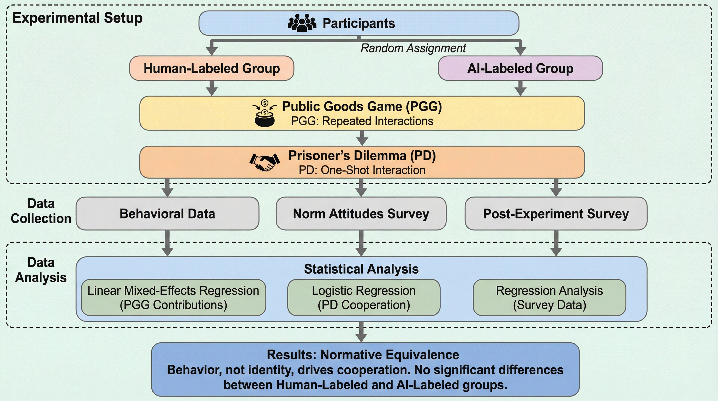 人間3名とAIエージェント1名で構成される小集団において、相手がAIであるか人間であるかという「正体」のラベルは、公共財ゲームにおける協力行動のレベルや規範の形成に有意な影響を与えないことが本研究により明らかになりました。 協力の維持を支える主要な要因は、相手のアイデンティティではなく、グループ内の相互的な力学や個人の行動の慣性といった規範的なメカニズムであり、これらは人間のみのグループと人間・AI混合グループの両方で同様の論理に基づいて機能します。 この「規範的同等性」の発見は、社会的な協力規範が人工的なエージェントに対しても柔軟に適用されることを示しており、AIが意思決定に参加する現代社会において、外見の人間らしさよりも行動の透明性と予測可能性が信頼構築に重要であることを示唆しています。