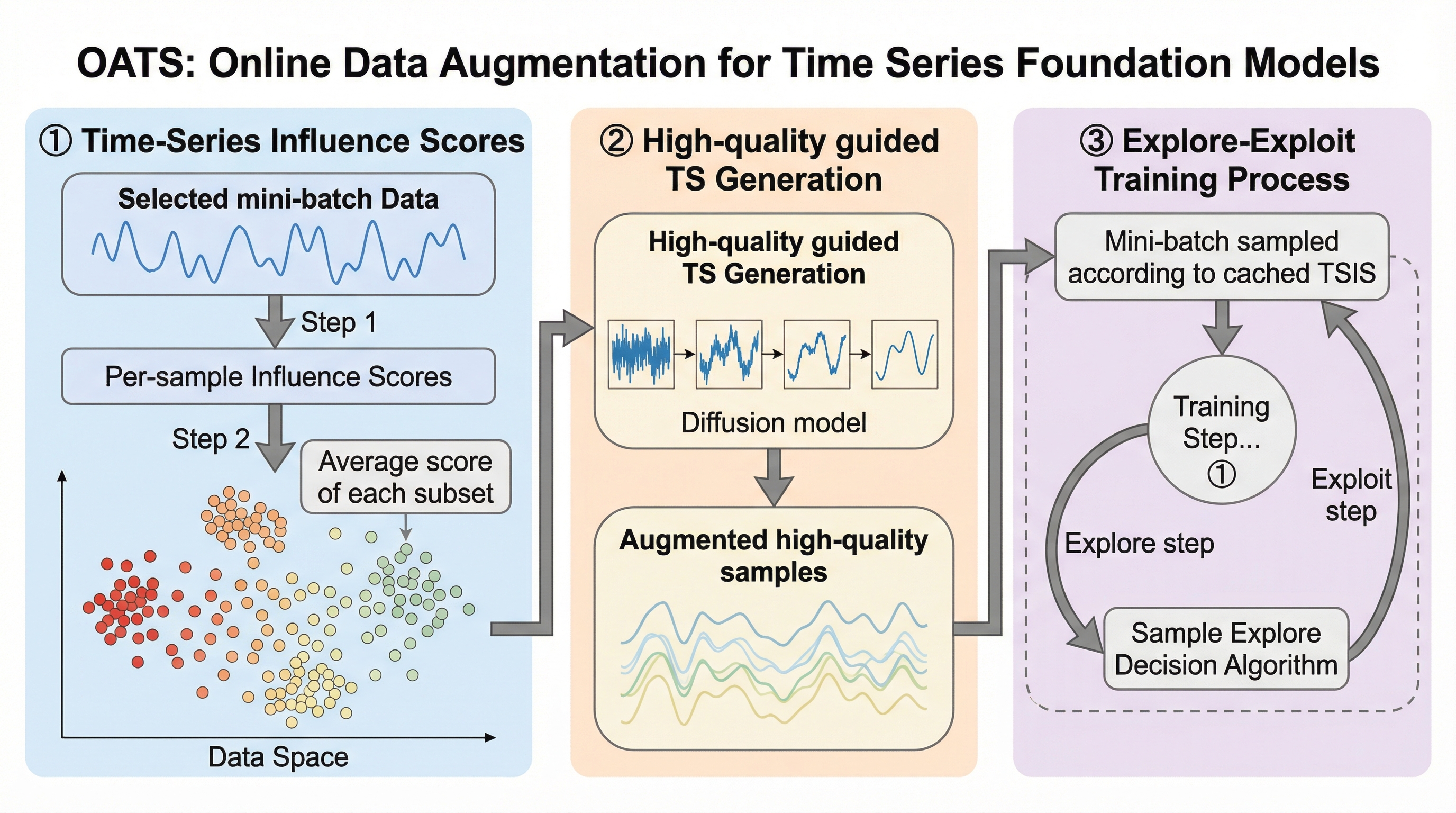 OATSは、時系列基盤モデル(TSFM)の学習を最適化するために、学習の進捗に合わせて動的に高品質な合成データを生成するオンラインデータ拡張手法である。 従来の静的な拡張手法とは異なり、データアトリビューションに基づき、モデルの損失減少に最も寄与するサンプルを特定する「時系列インフルエンススコア(TSIS)」を導入し、これをガイドとして拡散モデルでデータを生成する。 6つの主要データセットと2つの代表的なTSFMアーキテクチャを用いた検証において、OATSは従来の静的な拡張手法や通常学習を一貫して上回る予測精度と収束速度を達成し、計算効率と精度の両立を実現した。