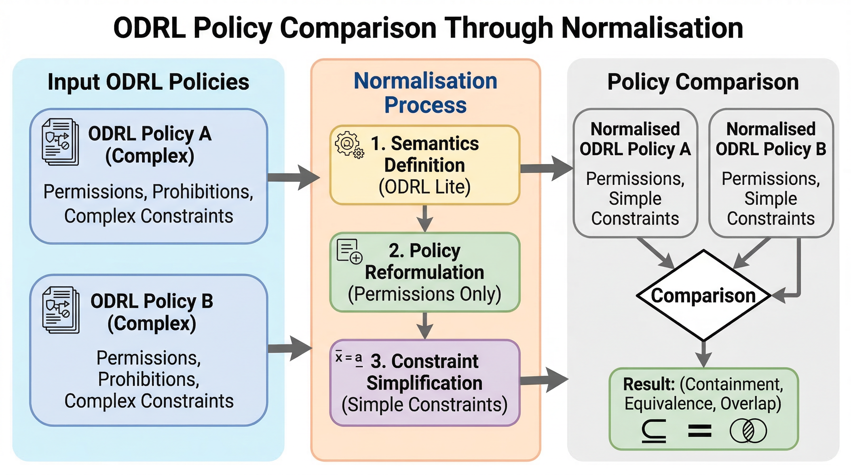 提案の中心は、ODRL の rule を最小構成要素まで分解し、意味を保ったまま normal form へ写像する手続きです。具体的には二段階あります。第一段階は constraint regularisation で、複雑な論理制約を simple constraints の論理和・論理積へ整理し、数値・記号条件を限定された比較演算へ正規化します。第二段階は interval constraint splitting で、数値区間に関する条件を既知の値集合に基づいて分割し、最終的に互いに重ならない simple rule の集合へ落とします。