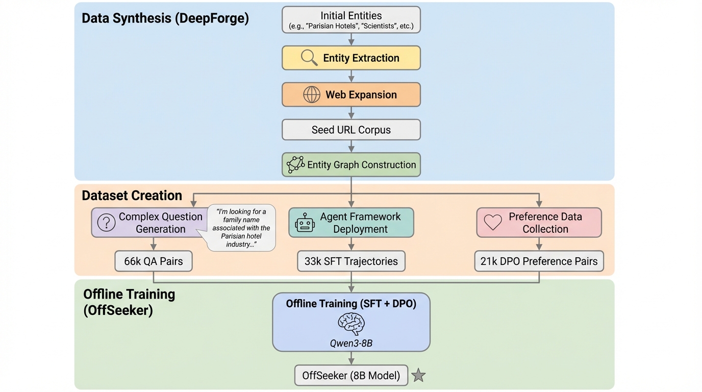 現在の最先端なディープリサーチエージェントの開発において主流となっている、高額なAPI費用と学習の不安定さを伴うオンライン強化学習に依存せず、高品質なオフライン学習のみで高性能なモデルを構築できることを実証しました。 大規模なタスク合成フレームワーク「DeepForge」を導入し、66k件のQA、33k件のSFT軌跡、21k件のDPOペアからなる高品質なオープンソースデータセットを公開することで、計算資源の限られた学術界や個人研究者による研究の民主化を強力に推進しています。 開発された8Bパラメータのモデル「OffSeeker」は、教師あり微調整と直接選好最適化のみで訓練されたにもかかわらず、オンライン強化学習を用いた30B規模の既存システムに匹敵、あるいは凌駕する性能を達成し、コスト効率と再現性を大幅に向上させました。