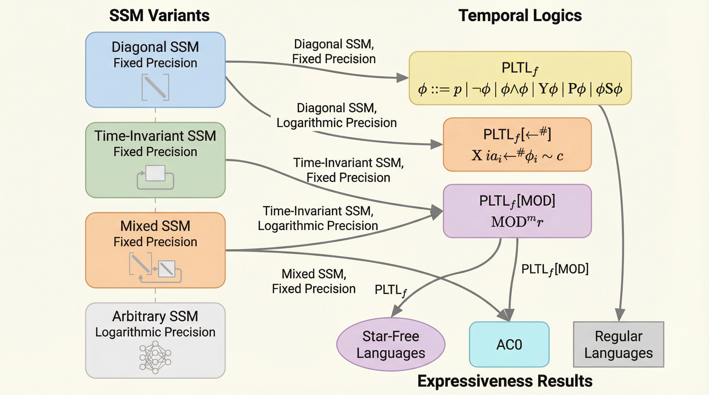 状態空間モデル(SSM)の表現能力は、採用されるゲート機構の構造と計算に使用される数値の精度に深く依存しており、特に対角ゲート型SSMは固定精度において過去時相論理(PLTLf)で定義可能なスターフリー言語を認識する能力を持つことが証明されました。 計算精度を対数精度へと拡張した場合、SSMは系列内の特定の要素を数え上げる計数操作が可能となり、正規言語の枠組みを超えた非文脈自由言語などの複雑なパターンを捉えることができるようになる一方で、固定精度では特定の周期的なパターンを認識できないという構造的な限界も存在します。 本研究では、時不変ゲートや混合レイヤーを持つSSMのバリアントについても体系的な比較を行い、トランスフォーマーの表現能力に関する既存の知見と統合することで、大規模言語モデルの代替候補としてのSSMが持つ理論的な計算能力の階層構造を論理学の視点から明確に位置づけています。