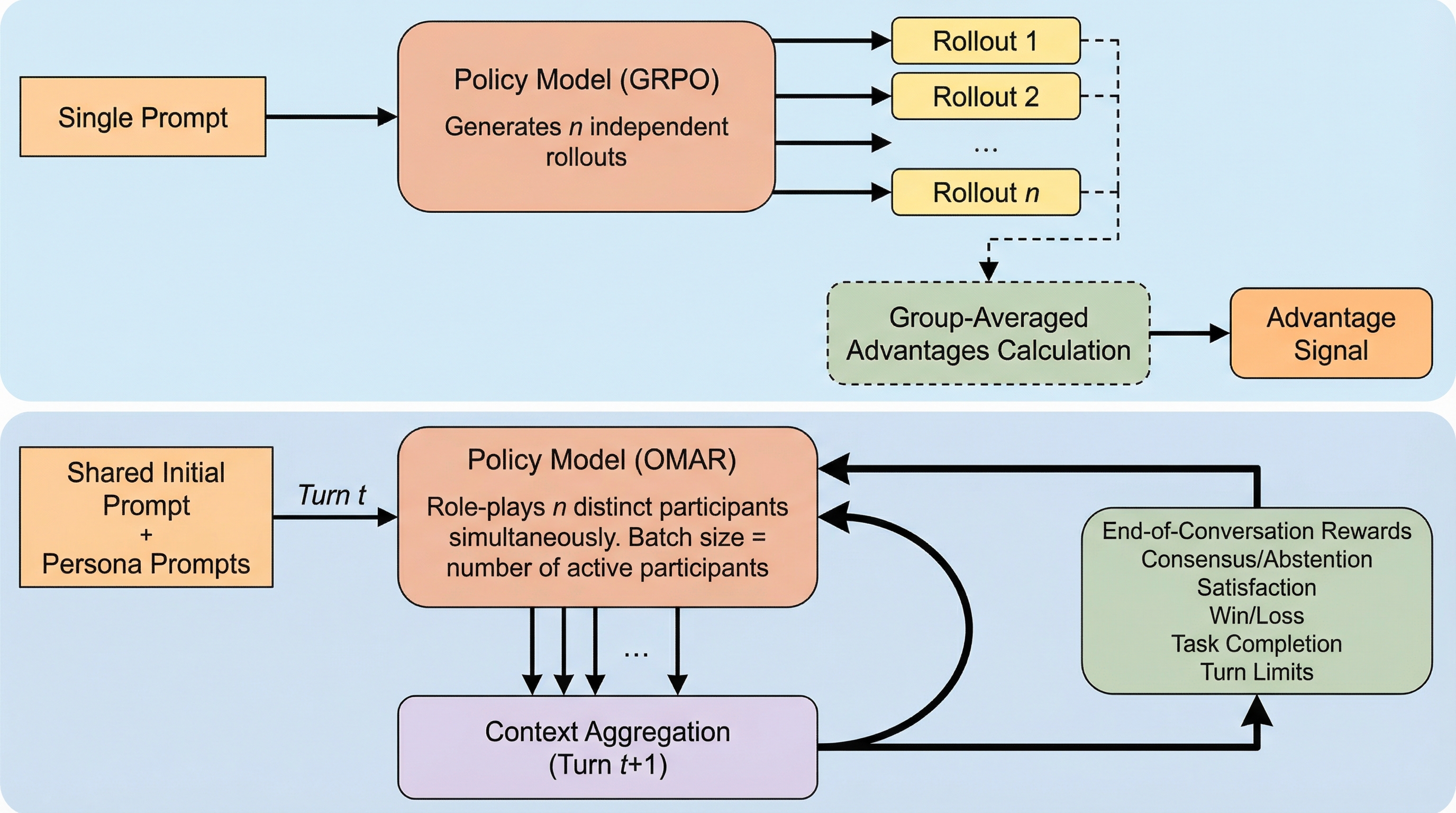 本論文では、多人数・多ターンの会話環境において言語モデルを訓練するための汎用的な強化学習フレームワーク「OMAR(One Model, All Roles)」を提案している。このフレームワークの最大の特徴は、その名称が示す通り、単一のモデルが会話におけるすべての役割を同時に演じる点にある。ユーザーは参加者の役割(ペルソナ)と目標、会話の終了条件、そしてエピソード終了時の報酬を定義するだけでよい。トレーニングが始まると、モデルは自分自身の異なるバージョンや異なる役割と対話を行い、最終的な報酬を最大化するための戦略と社会的知能を自律的に発達させていく。 OMARは、マルチエージェント間の相互作用を単一モデルによるシミュレーションへと変換することで、システムの複雑さを大幅に軽減している。…