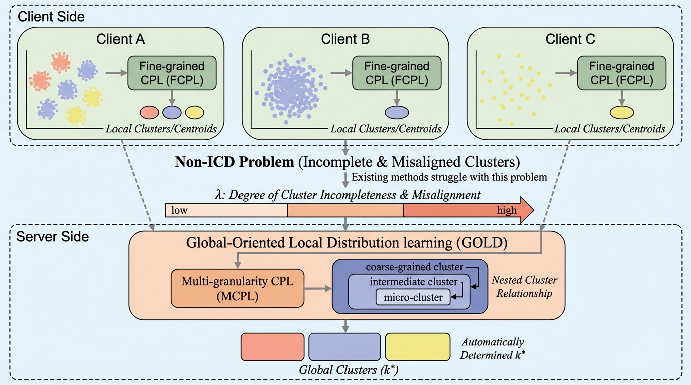 連合学習におけるクラスタリングにおいて、データが複数のクライアントに断片化して分布し、粒度が一致しない「Non-ICD(非独立完全分散)」という新たな課題を定義し、既存手法がこの状況下で大幅に精度を低下させることを明らかにしました。 この問題に対処するため、競合ペナルティ学習(CPL)を導入し、クライアント側での微細な分布探索(FCPL)とサーバー側での多粒度な統合(MCPL)を一度の通信で行う、プライバシー保護と高精度を両立した新フレームワーク「GOLD」を提案しました。 広範な実験の結果、GOLDは最適なクラスター数が未知の状況でも自動的に適切な構造を導き出し、Non-ICDの度合いが高まる環境下において既存の最先端手法と比較して10%以上の精度向上を達成し、解釈可能な入れ子状のクラスター関係を提供することを確認しました。