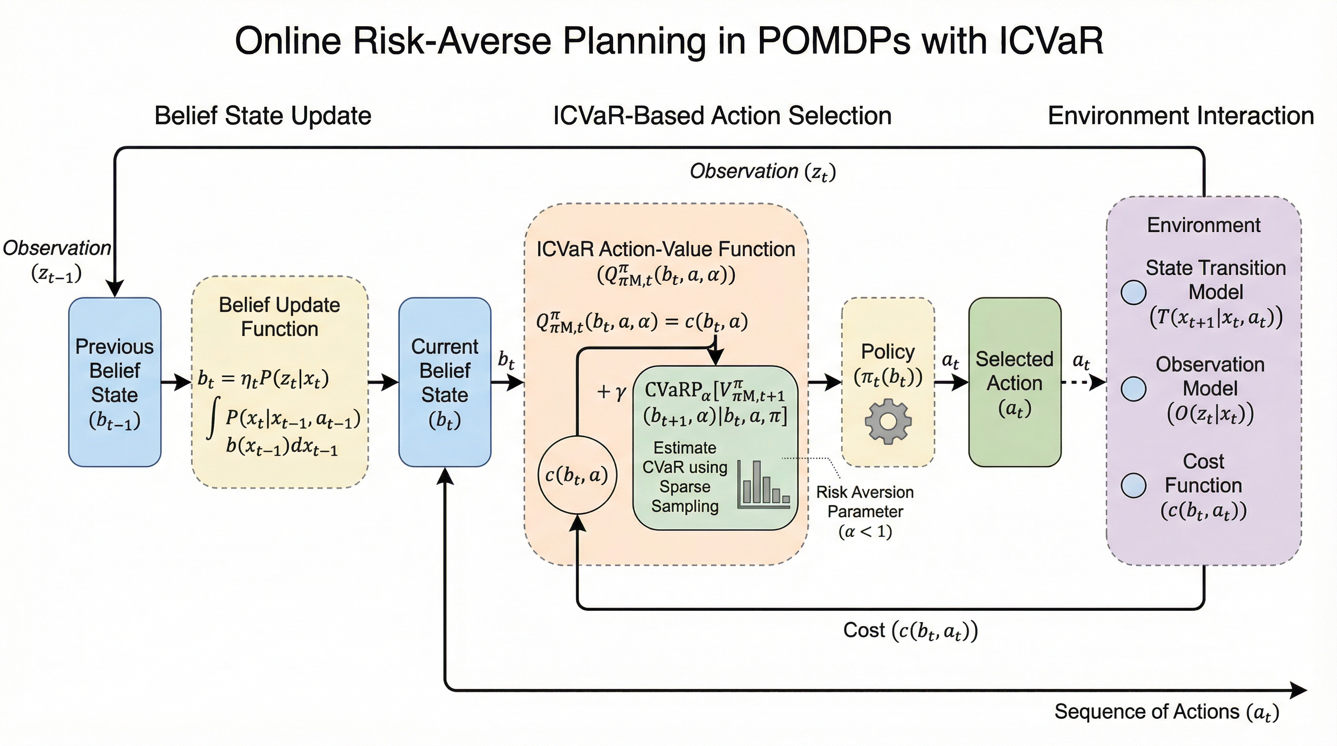 本研究は、部分観測マルコフ決定過程(POMDP)において、動的リスク尺度である反復条件付きバリューアットリスク(ICVaR)を価値関数として採用した、世界初のオンラインリスク回避計画フレームワークを提案しています。