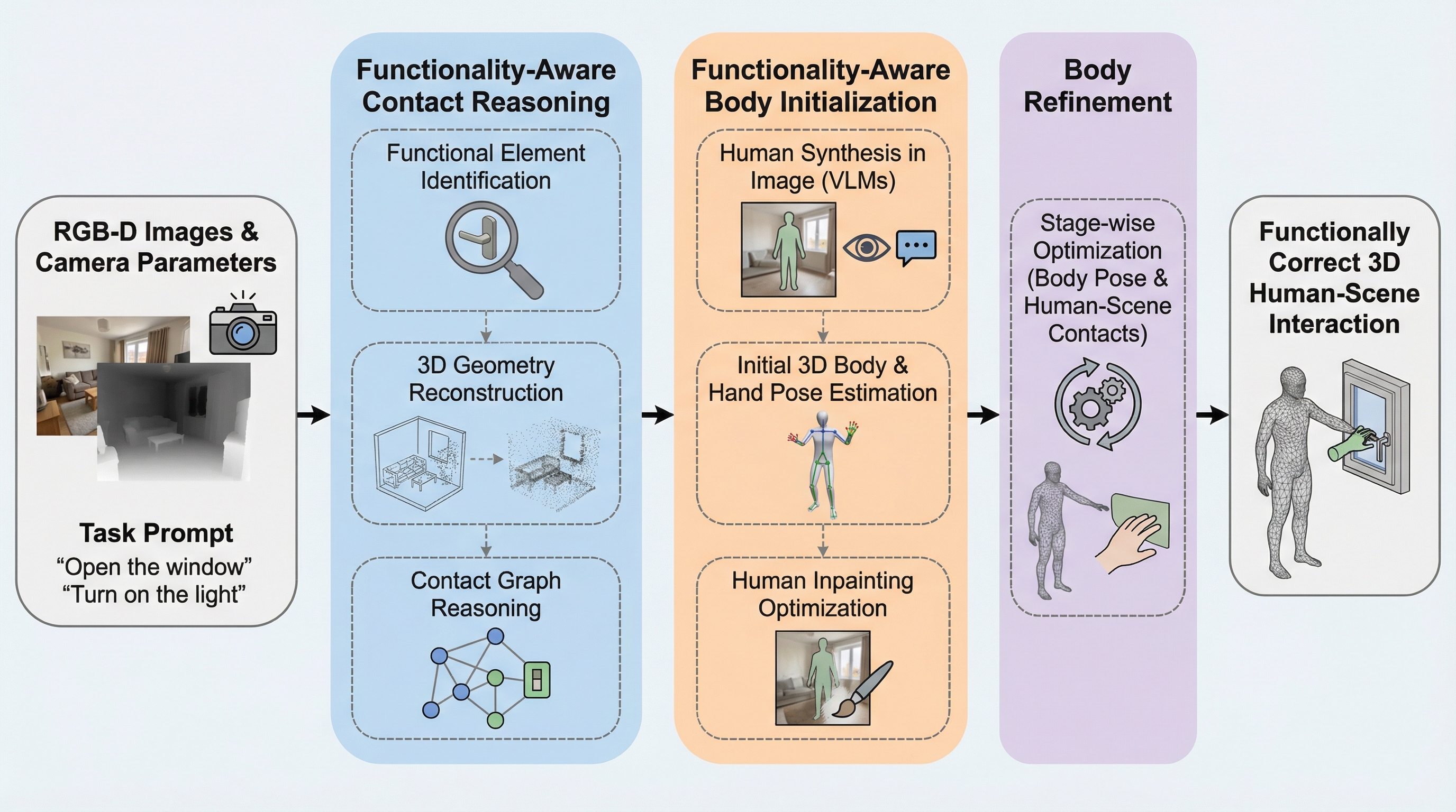 FunHSIは、事前の追加学習を必要としないトレーニングフリーなフレームワークであり、オープンボキャブラリーな指示に基づいて、3Dシーン内の特定の機能的要素と人間が正しく相互作用する様子を生成します。