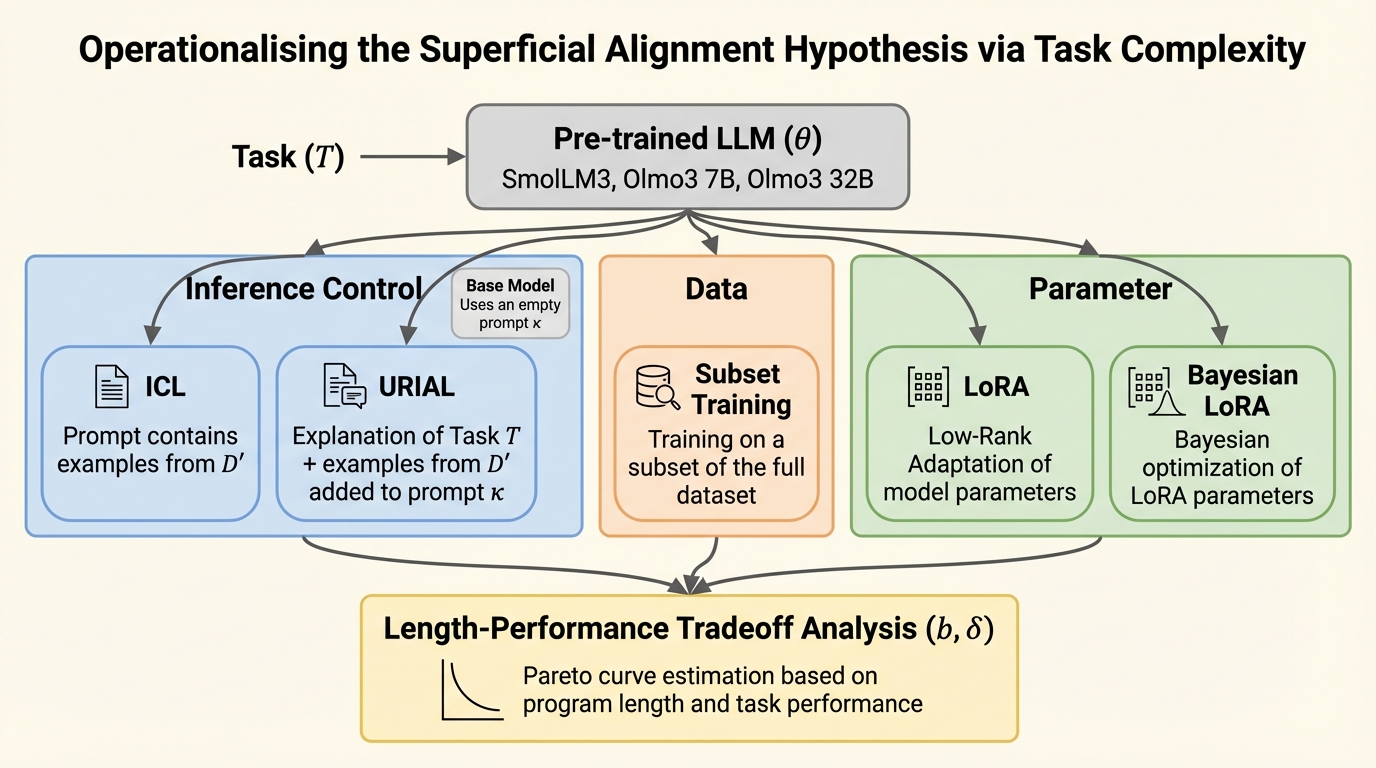 SAHは「大規模言語モデルは事前学習で知識の大半を得て、事後学習はそれを表に出すだけ」という見立てですが、重要語の定義が曖昧なため、支持と批判が同じ土俵で噛み合いにくい状況でした。 / 本研究は、目標性能を満たすための「最短プログラム長」をタスク複雑性として定義し、少量データでの微調整、少数パラメータ更新、推論時のプロンプト制御を、短いプログラムを見つけるための別戦略として同一の指標で比較できるようにします。 / 数学推論・機械翻訳・指示追従で複雑性を推定したところ、事前学習モデルへのアクセスにより複雑性が非常に小さくなり得る一方、強い性能へ到達するには長大なプログラムが必要になる場合もあり、事後学習は同等の性能へ到達する複雑性を大きく縮め、適応に必要な情報が数キロバイトで足りることが多いと示されました。