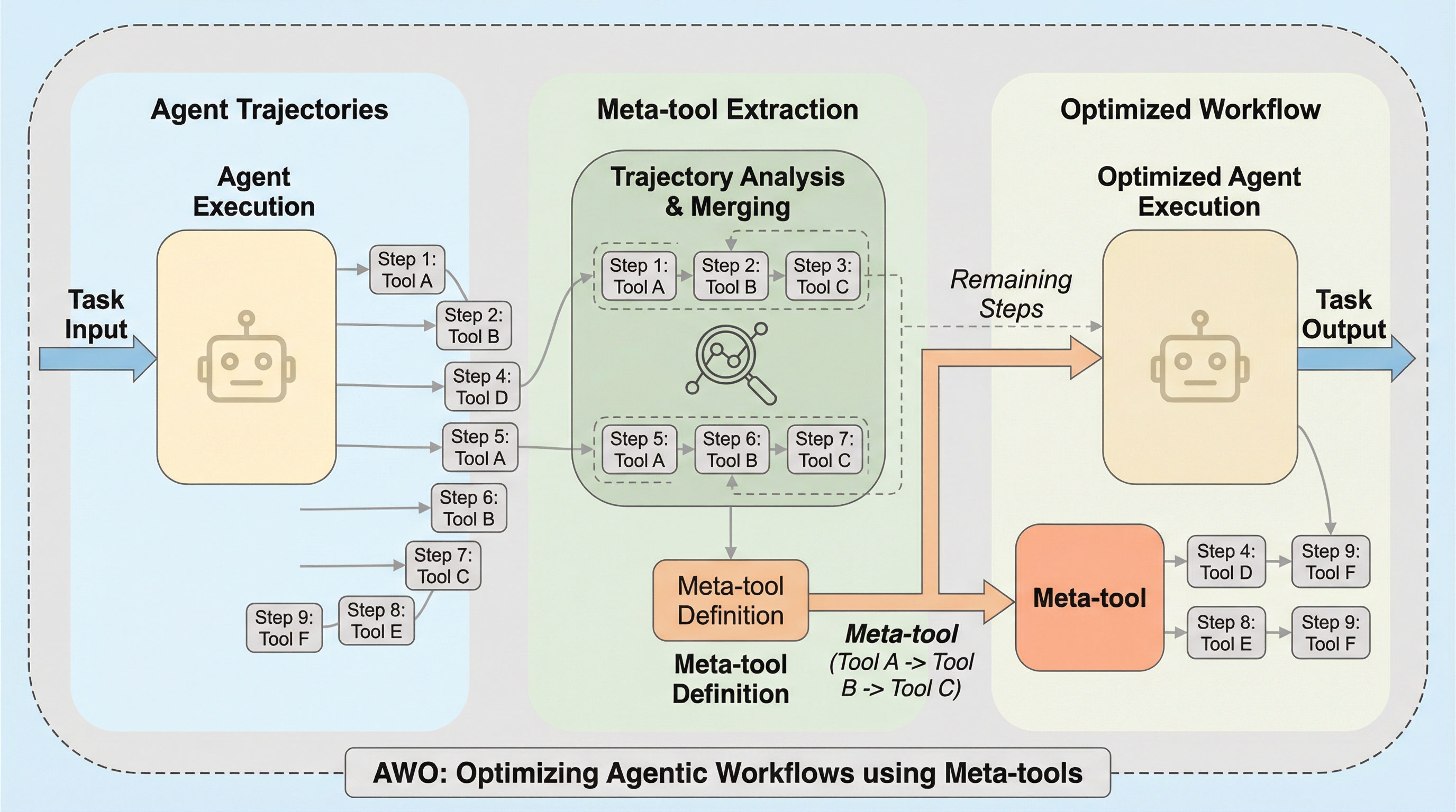 本論文では、エージェント型ワークフローの効率性、有用性、および実行コストを改善するための汎用的なフレームワークである「Agent Workflow Optimization(AWO)」を提案しています。 AWOの核心的なアイデアは、エージェントの実行軌跡(トラジェトリ)に含まれる構造的なツール呼び出しのパターンを特定し、それらを「メタツール」として統合することにあります。 メタツールとは、複数のエージェントのアクションを一つの呼び出しにまとめた確定的な複合ツールのことであり、これを利用することで、本来必要だった中間的なLLMの推論ステップをバイパスすることが可能になります。 このアプローチにより、エージェントは高レベルなワークフローの構成能力を維持したまま、ルーチン化されたサブタスクを効率的に実行できるようになり、推論コストと遅延の両方を削減できます。…