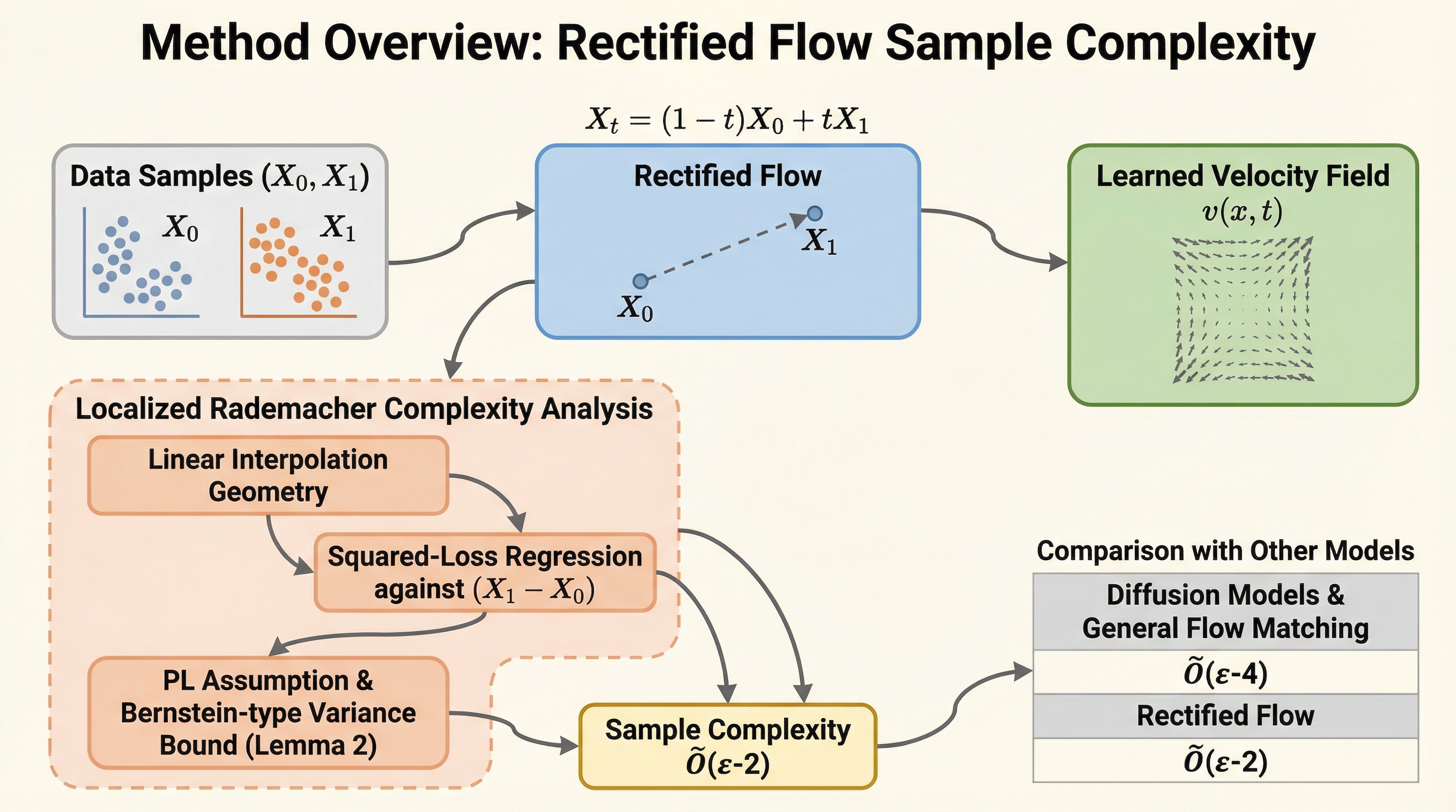 本研究の核心は、Rectified Flowが標準的な滑らかさとサブガウス性の仮定の下で、ワッサースタイン距離におけるターゲット分布の学習において、オーダー最適な $\tilde{O}(\epsilon^{-2})$ のサンプル複雑度を達成することを初めて証明した点にあります。これは、拡散モデルや一般的なフローマッチングモデルの上限境界を劇的に改善する結果であり、RFが統計的に最適な生成モデルであることを決定づけるものです。この結果を導き出すための主要な技術的貢献として、RFの幾何学的構造と学習目的に特化した「局所ラデマッハ複雑度解析」の開発が挙げられます。…
