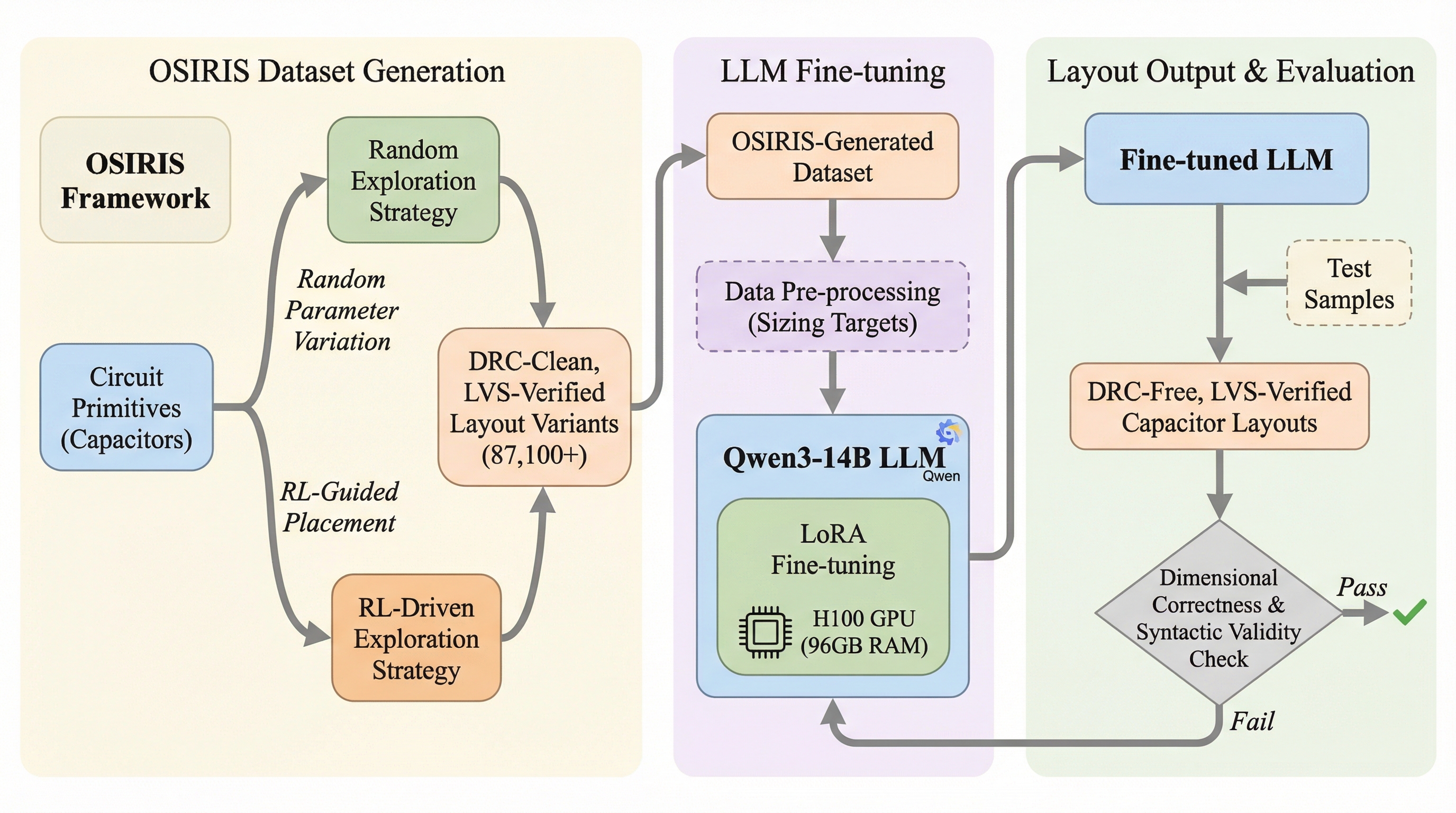 本研究では、アナログIC設計におけるバックエンド自動化と機械学習研究を促進するために、スケーラブルなデータセット生成パイプラインである「OSIRIS」を提案しました。OSIRISは、従来のシングルパスの自動化手法とは異なり、性能駆動型の反復的なレイアウト設計空間探索を可能にするエンドツーエンドのフレームワークです。このシステムは、回路の論理的な機能を維持したまま、物理的な実装のバリエーションを大量に生成し、それぞれの性能を評価する機能を備えています。 OSIRISの主な貢献は三つの点に集約されます。第一に、一般的なアナログ回路に対して、DRCを遵守しLVS検証済みのレイアウトを数万規模で効率的に生成、検証、評価するパイプラインを構築したことです。本研究ではその能力を示す例として、87,100個のレイアウトを含むデータセットを生成し、公開しました。…
