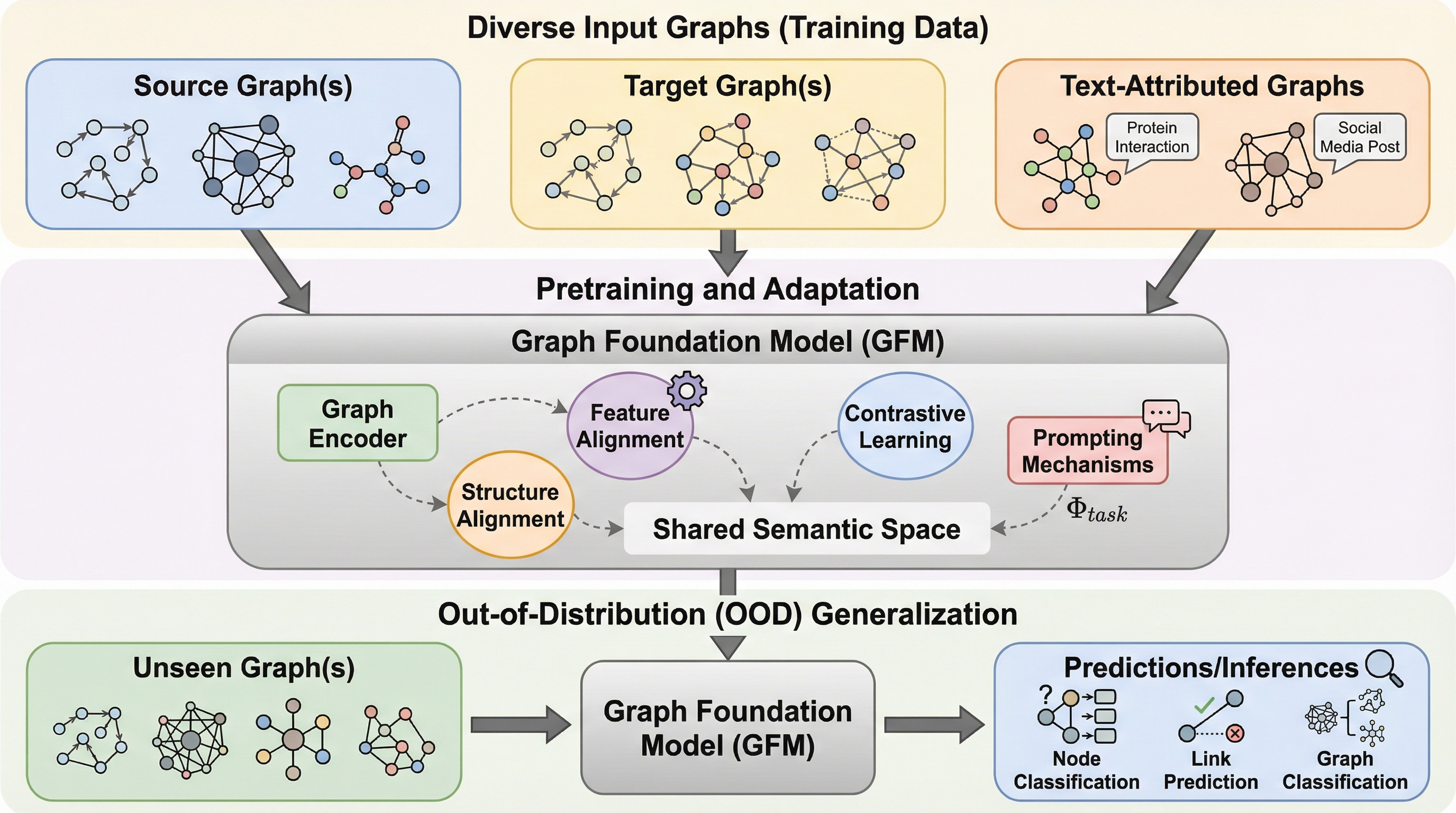 グラフ基盤モデル(GFM)は、多様なグラフデータから汎用的な表現を学習し、未知のデータ分布(分布外、OOD)に対しても高い適応力を発揮することを目指す新しいパラダイムであり、本論文はその最新動向を「分布外汎化」の観点から整理した初の包括的サーベイである。 グラフ学習における分布シフトを「構造・ドメイン・モダリティ・タスク」の4つの階層で定義し、既存モデルを「均一タスク型」と「不均一タスク型」に分類することで、大規模事前学習がどのように特定のデータセット特有のバイアスを排除し、不変な特徴を抽出しているかを体系化している。 不変表現学習、ドメイン整列、プロンプト技術、大規模言語モデル(LLM)との統合といった戦略を詳細に分析し、ラベルの少ない未知の環境においても再学習なしで高精度な推論を可能にするための技術的指針と、負の転移や動的グラフへの対応といった今後の重要課題を提示している。