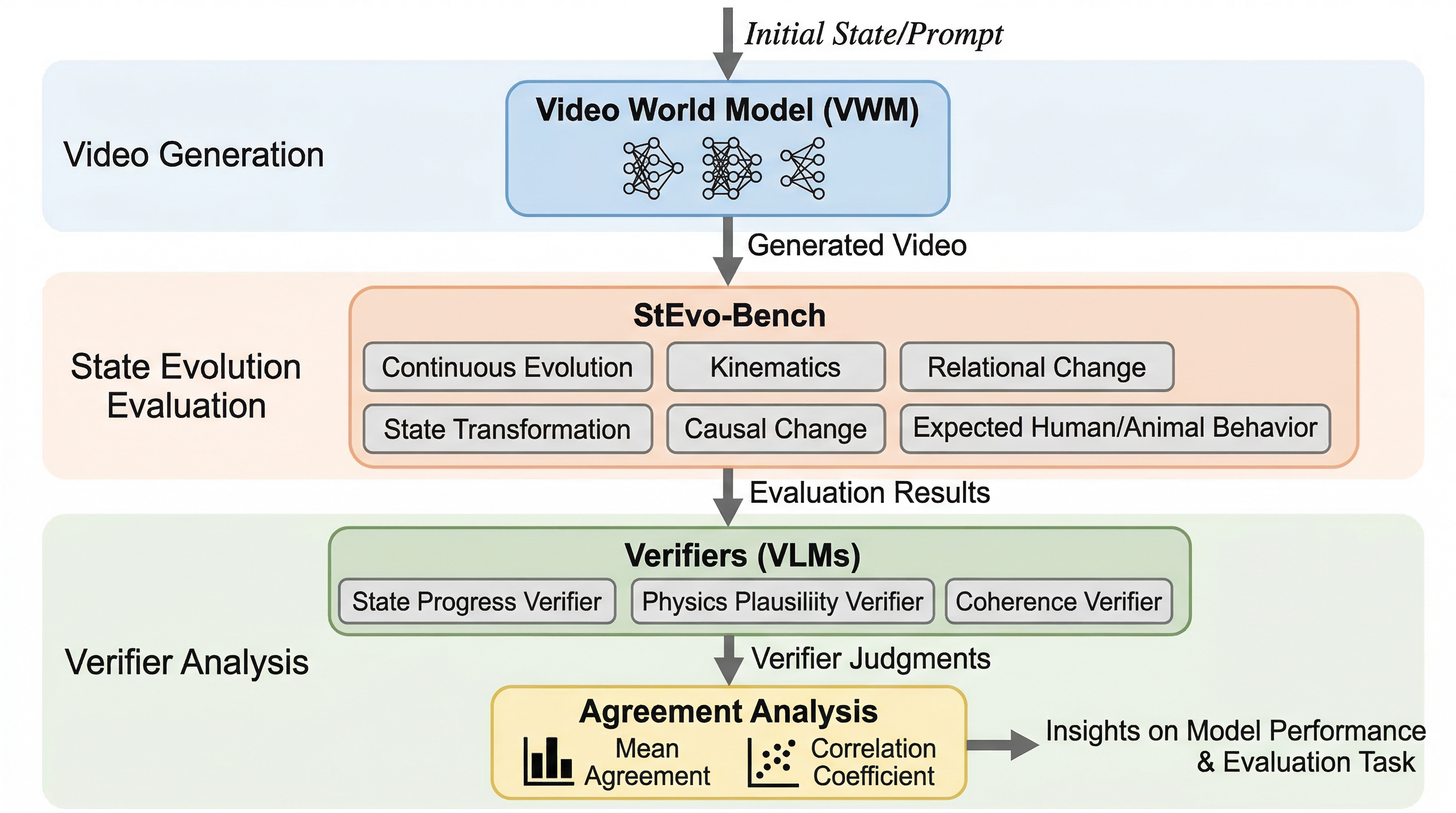 中心提案は StEvo-Bench というベンチマークです。狙いは、動画ワールドモデルが state evolution、つまり対象物の状態変化を「観測」から切り離して扱えるかを測ることです。設計上の要点は、動的なプロセスに対して必ず二つの制御をかけるところにあります。ひとつは変化を始めるための action control、もうひとつは途中で見えなくするための observation control です。この二段構えにより、「変化そのものを起こせなかった」のか、「見えなくなった途端に止まった」のかを分けて評価できます。