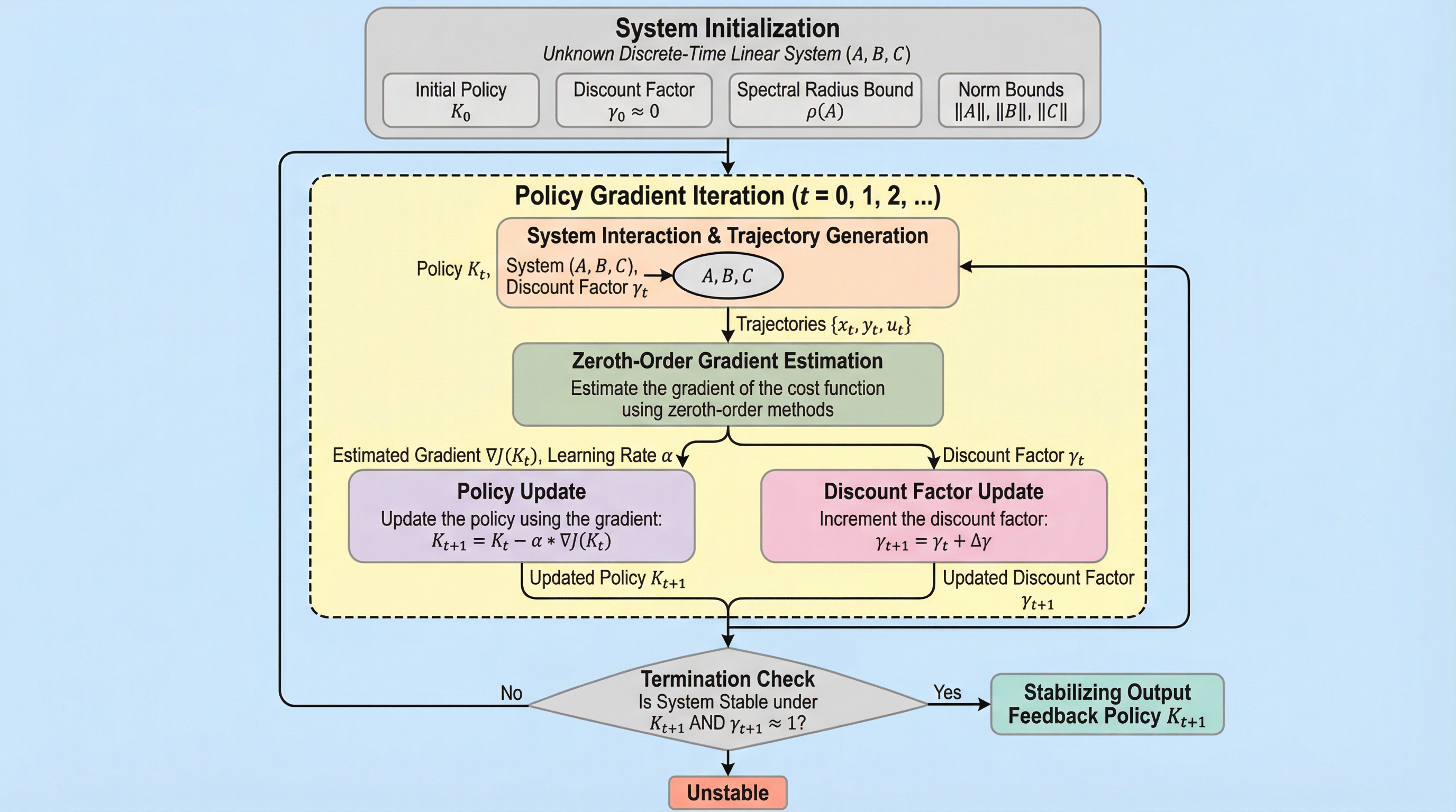 本研究の核心は、未知の離散時間線形システムに対して、静的出力フィードバック(SOF)コントローラを学習するための新しいモデルフリーなアルゴリズムの枠組みを提案したことにある。具体的には、開ループで不安定なシステムを安定化させるために、割引因子を用いた「割引法」を出力フィードバックの設定に拡張して導入している。この手法は、元の不安定なシステムの安定化問題を、適切に選択された割引因子を持つ一連の減衰システムの学習問題へと変換するものである。これにより、初期状態としてゼロ方策のような単純な方策から開始し、割引因子を段階的に1に近づけていくことで、最終的に元のシステムの安定化コントローラを得ることが可能になる。…